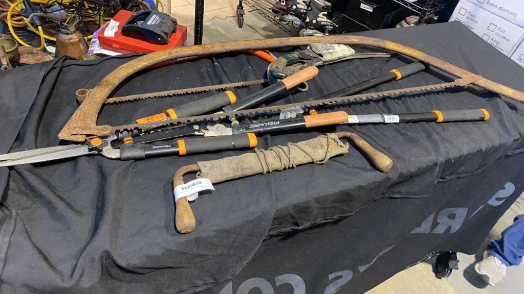 LOT OF PRUNERS, FISKARS, CROWBARS, DRAWKNIFE AND SAW