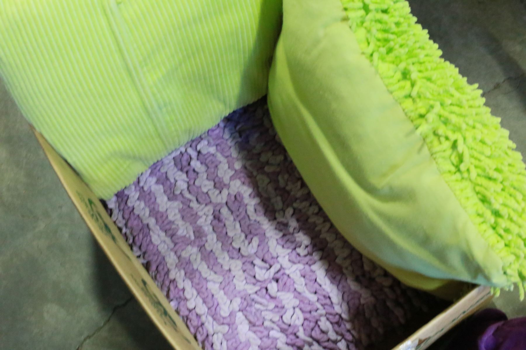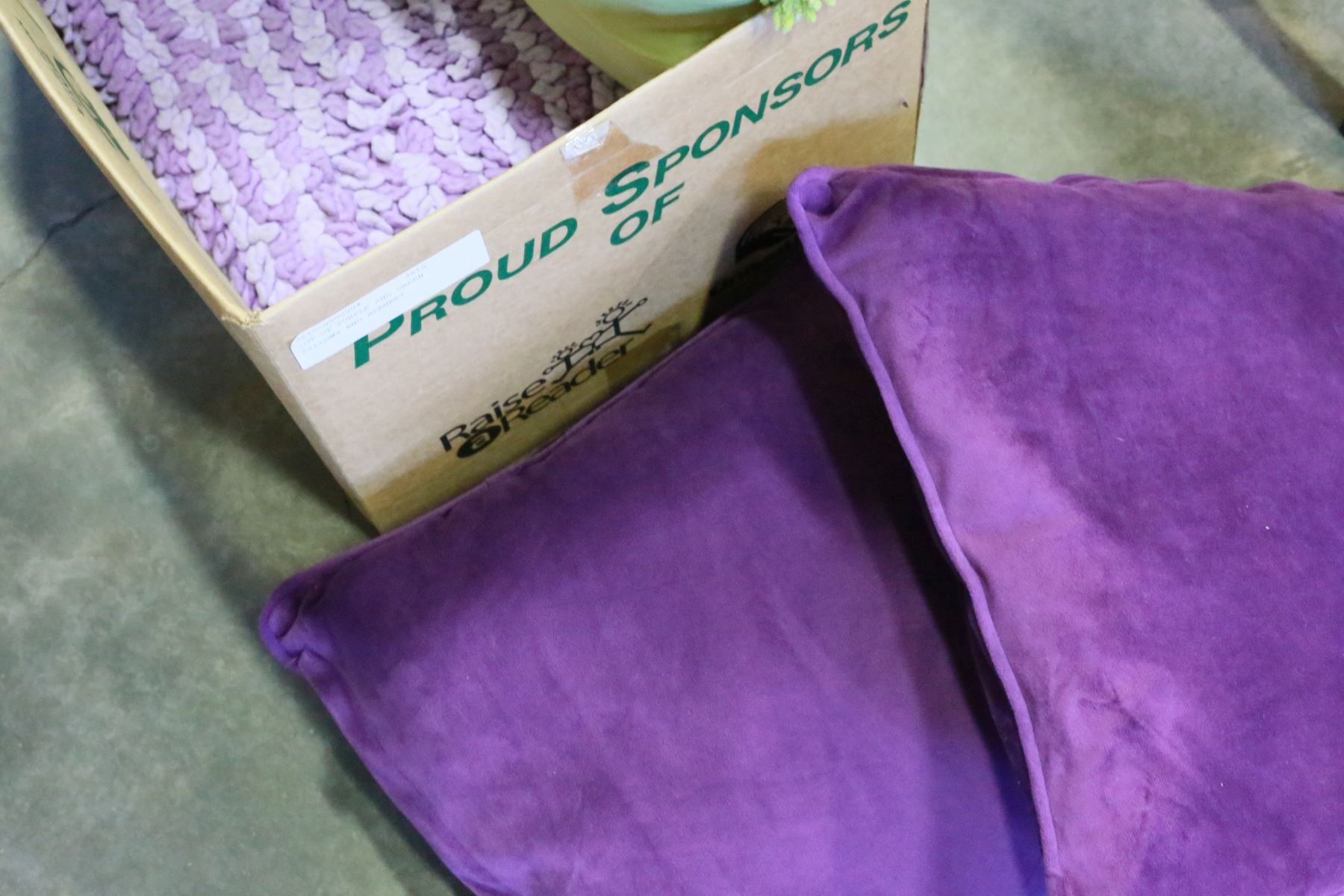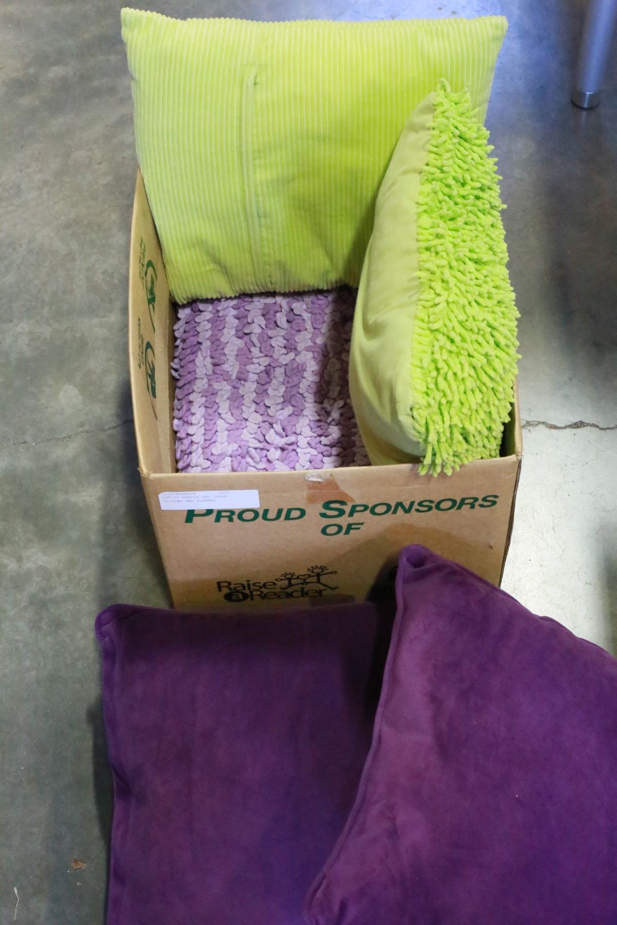 LOT OF PURPLE AND GREEN PILLOWS AND RUG