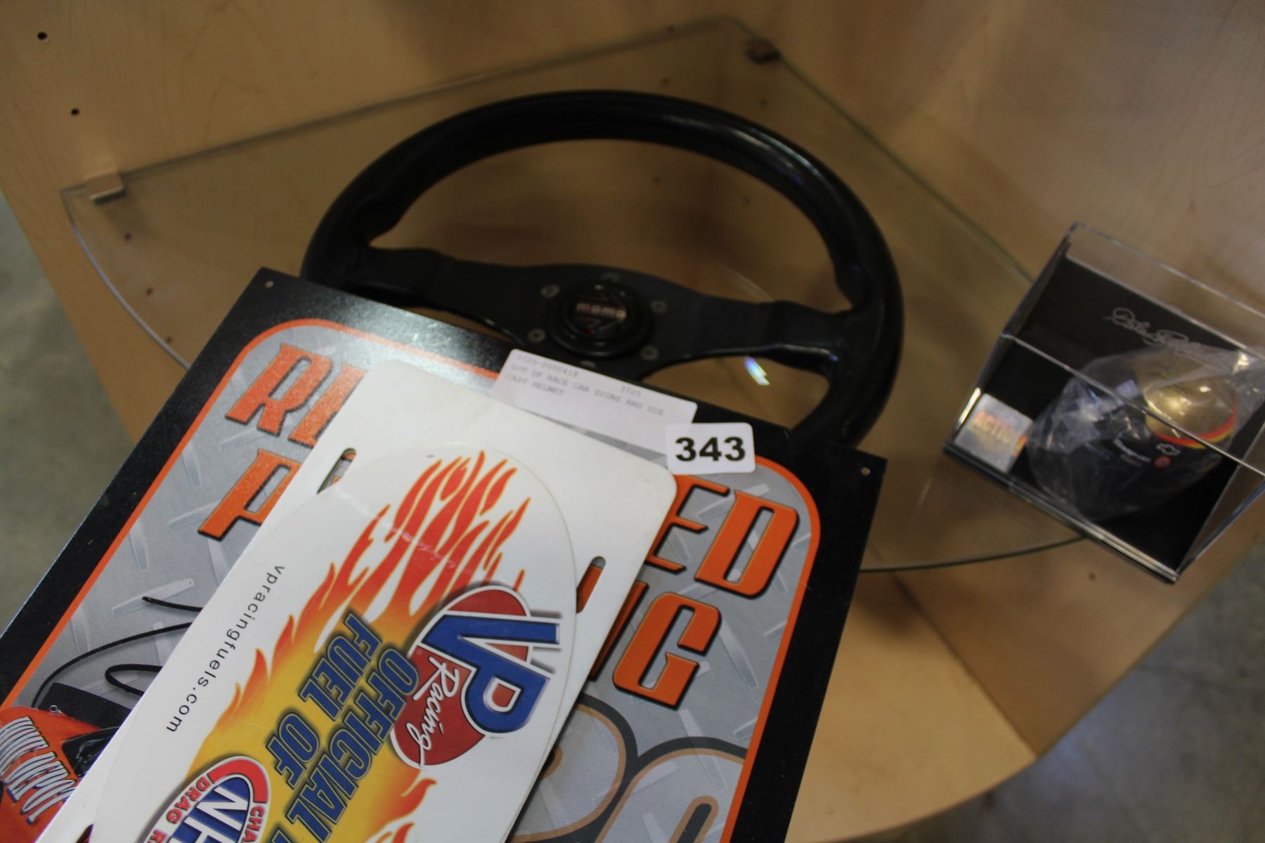 LOT OF RACE CAR SIGNS AND DIE CAST HELMET