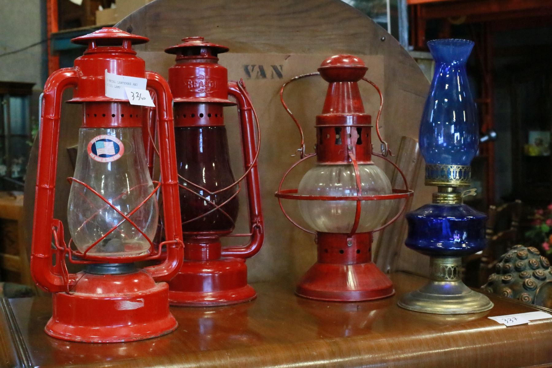 LOT OF RED METAL LANTERNS AND BLUE GLASS OIL LAMP