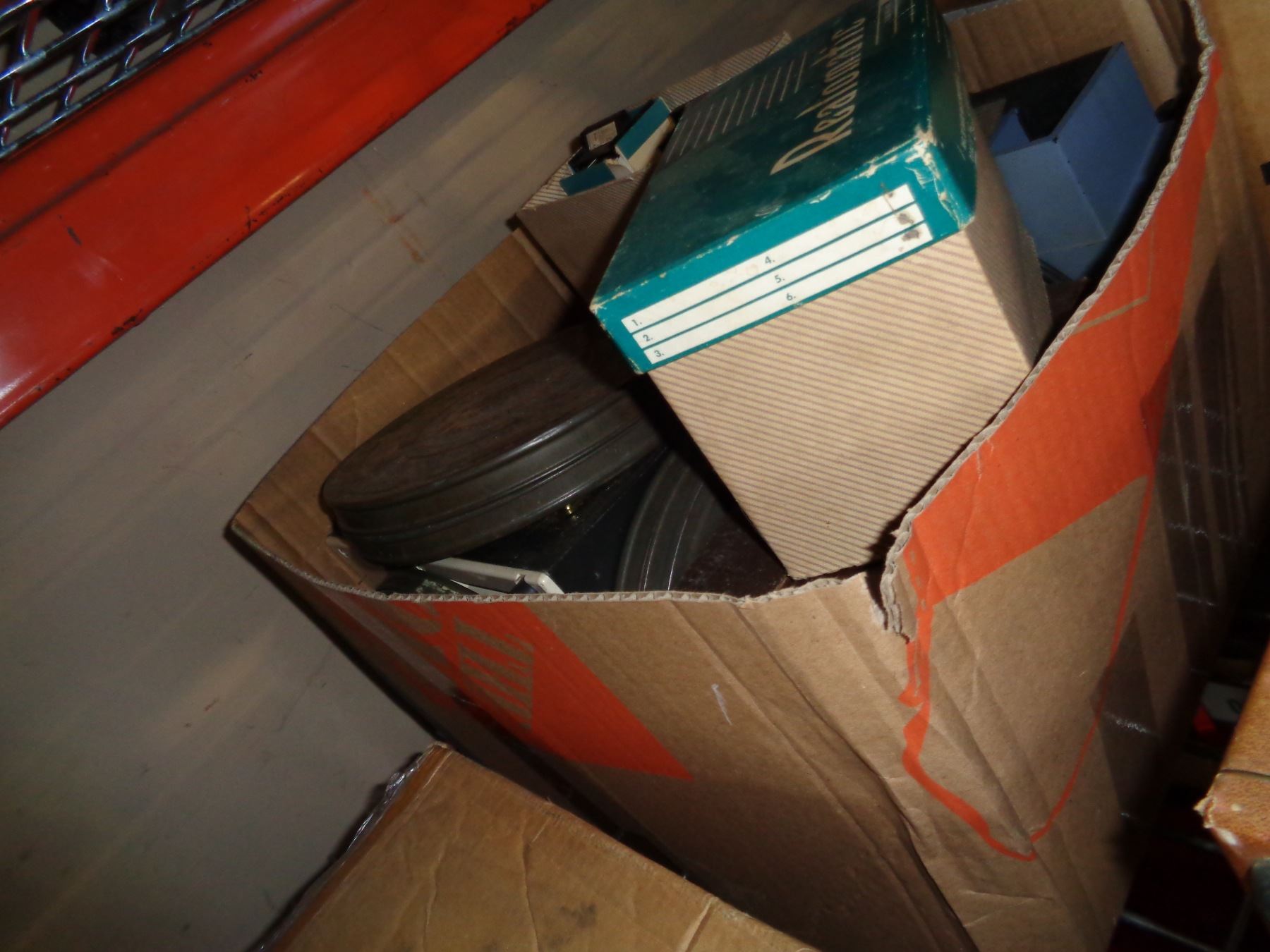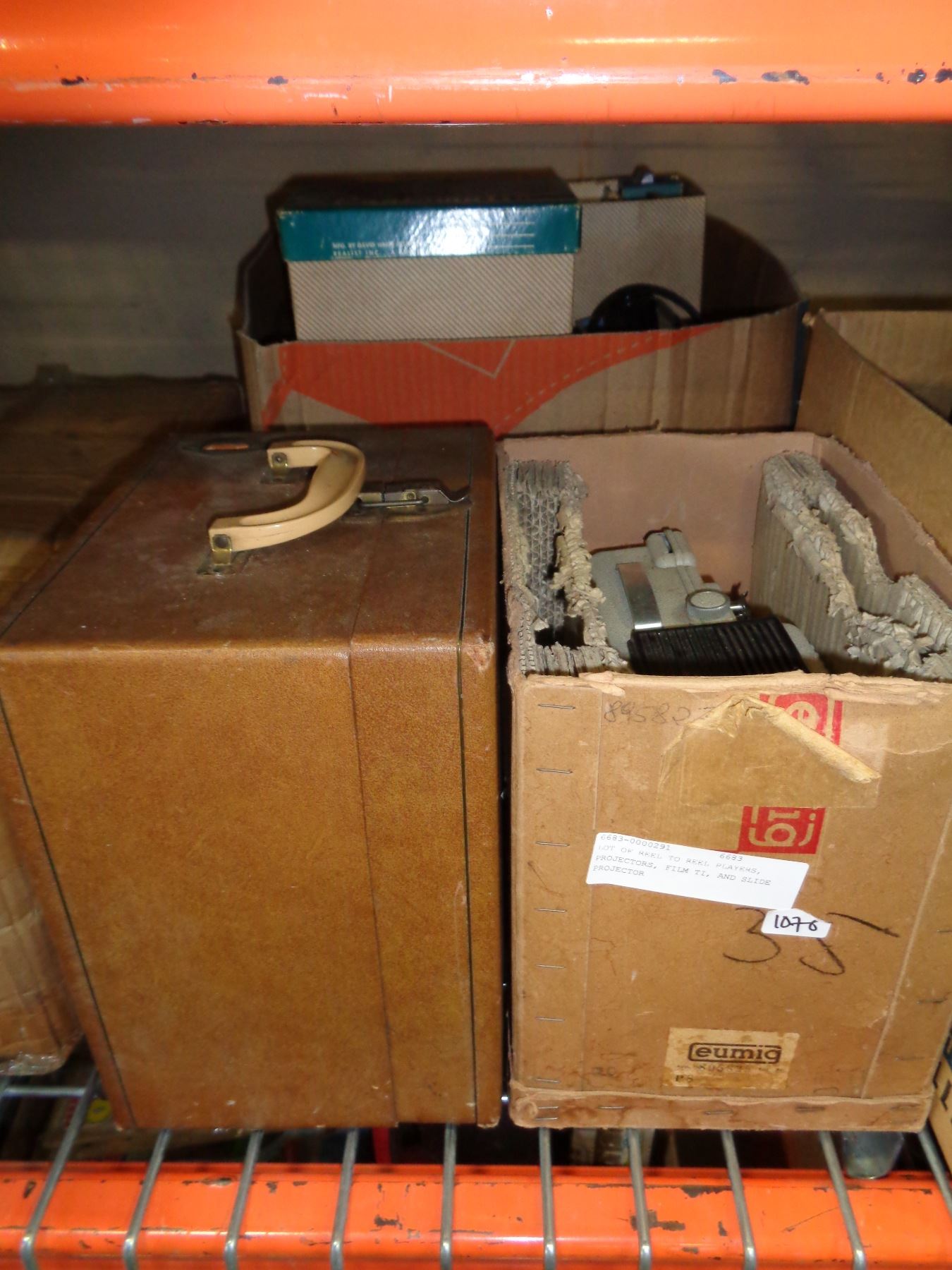 LOT OF REEL TO REEL PLAYERS, PROJECTORS, FILM TINS, AND SLIDE PROJECTOR