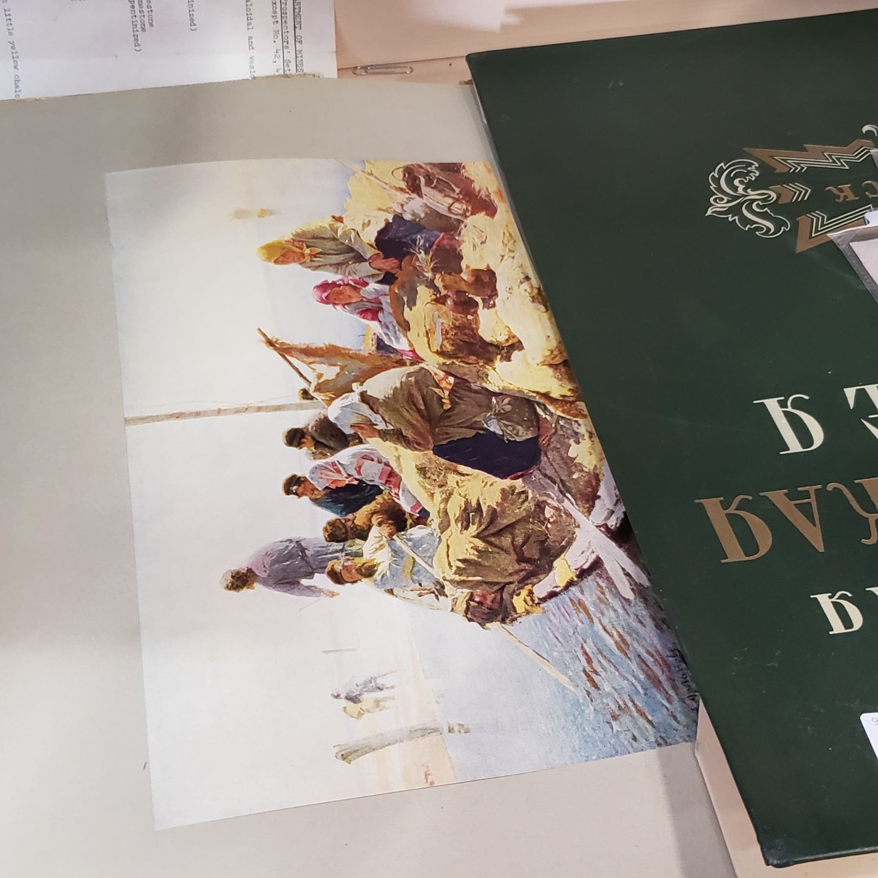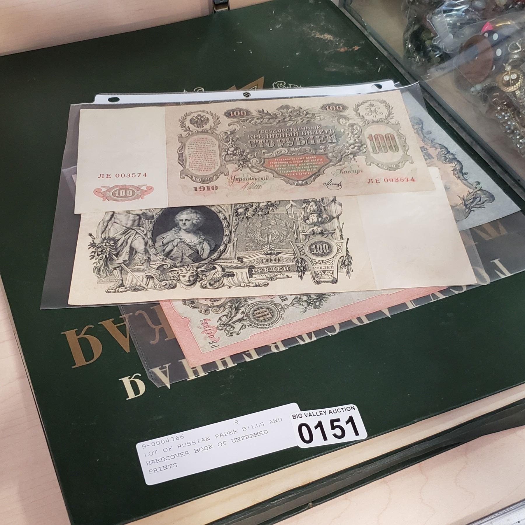 LOT OF RUSSIAN PAPER BILLS AND HARDCOVER BOOK OF UNFRAMED PRINTS