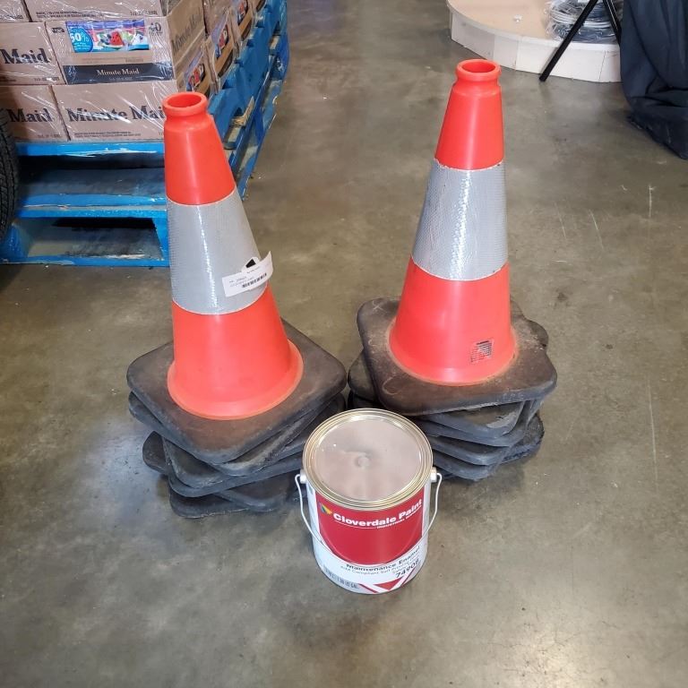 LOT OF SAFETY CONES AND PAIL OF SAFETY YELLOW PAINT