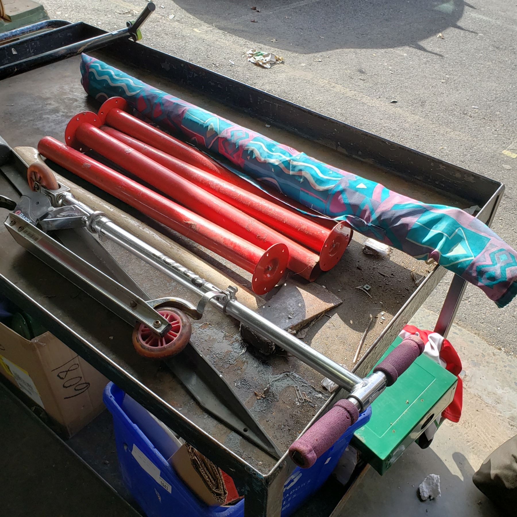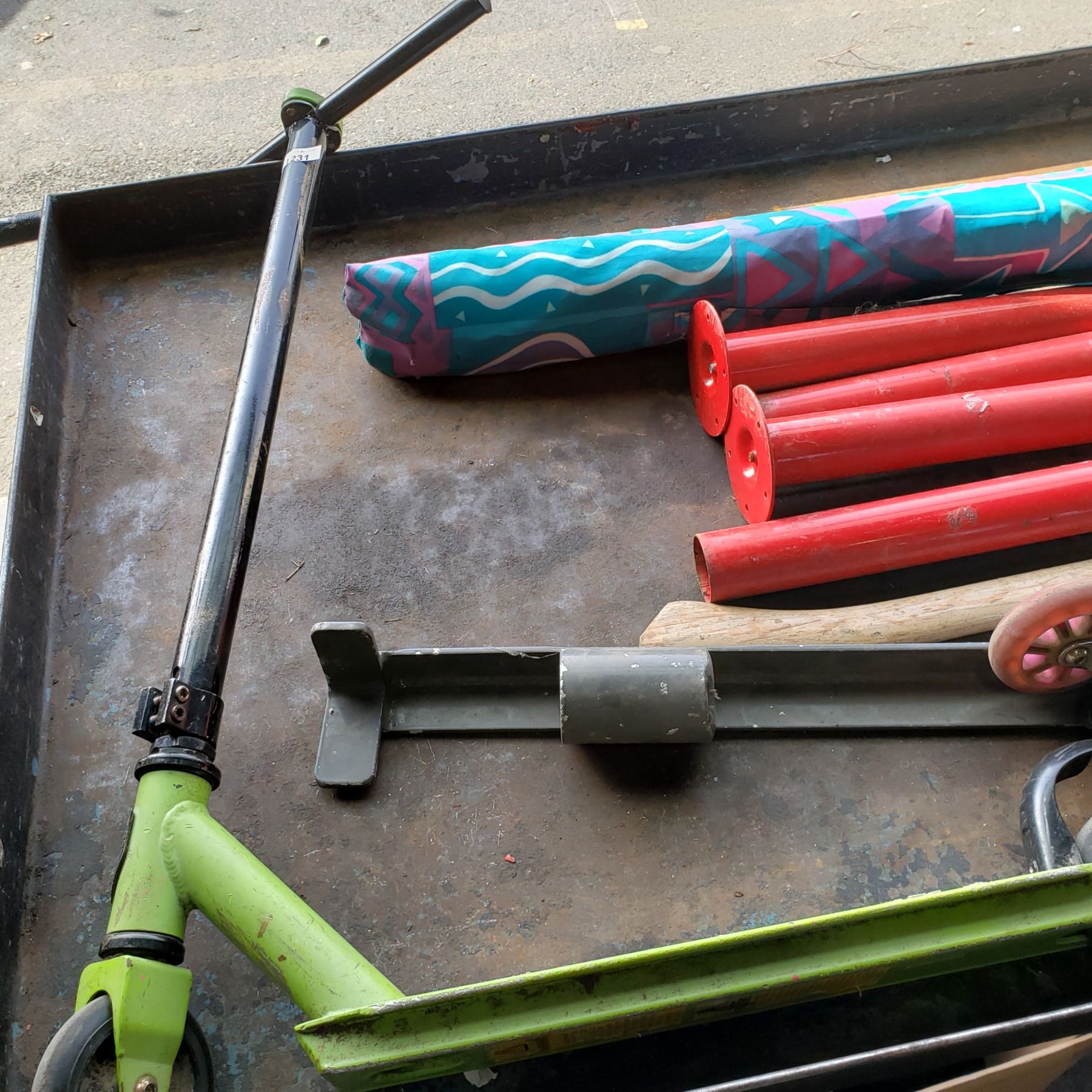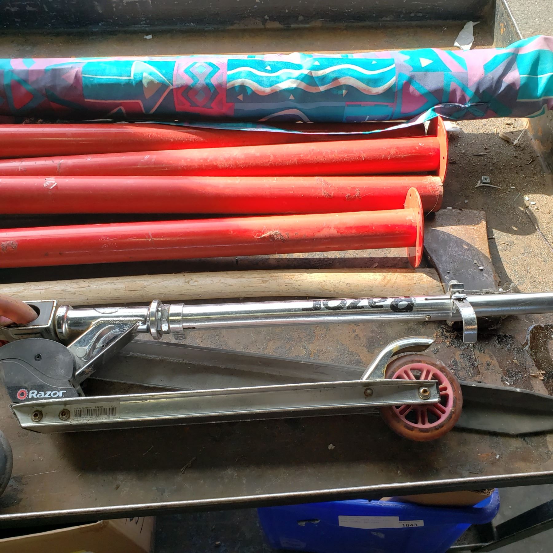 LOT OF SCOOTERS, UMBRELLA, AXE, ROD HOLDER AND MORE