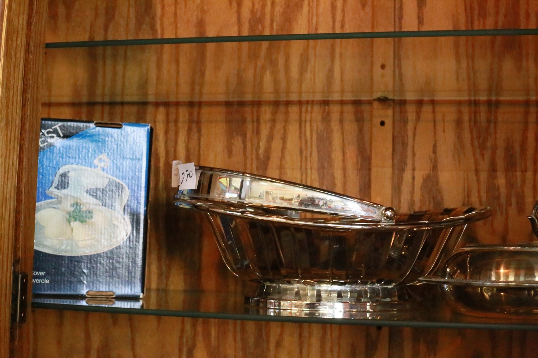 LOT OF SILVER PLATE, CRYSTAL + BRASS SERVING PIECES