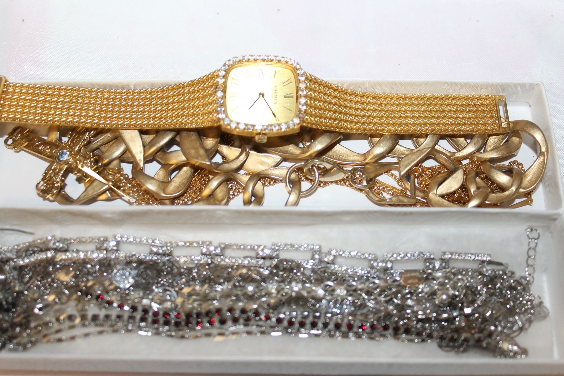 LOT OF SILVER TONE JEWELLRY AND GOLD TONE CHAINS AND WATCH