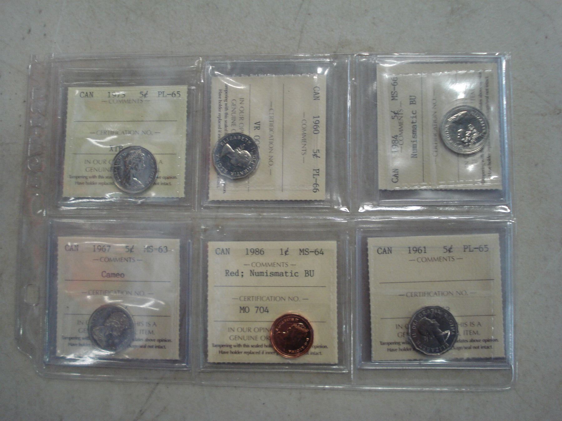 LOT OF SIX ICCS GRADED NICKELS AND PENNY