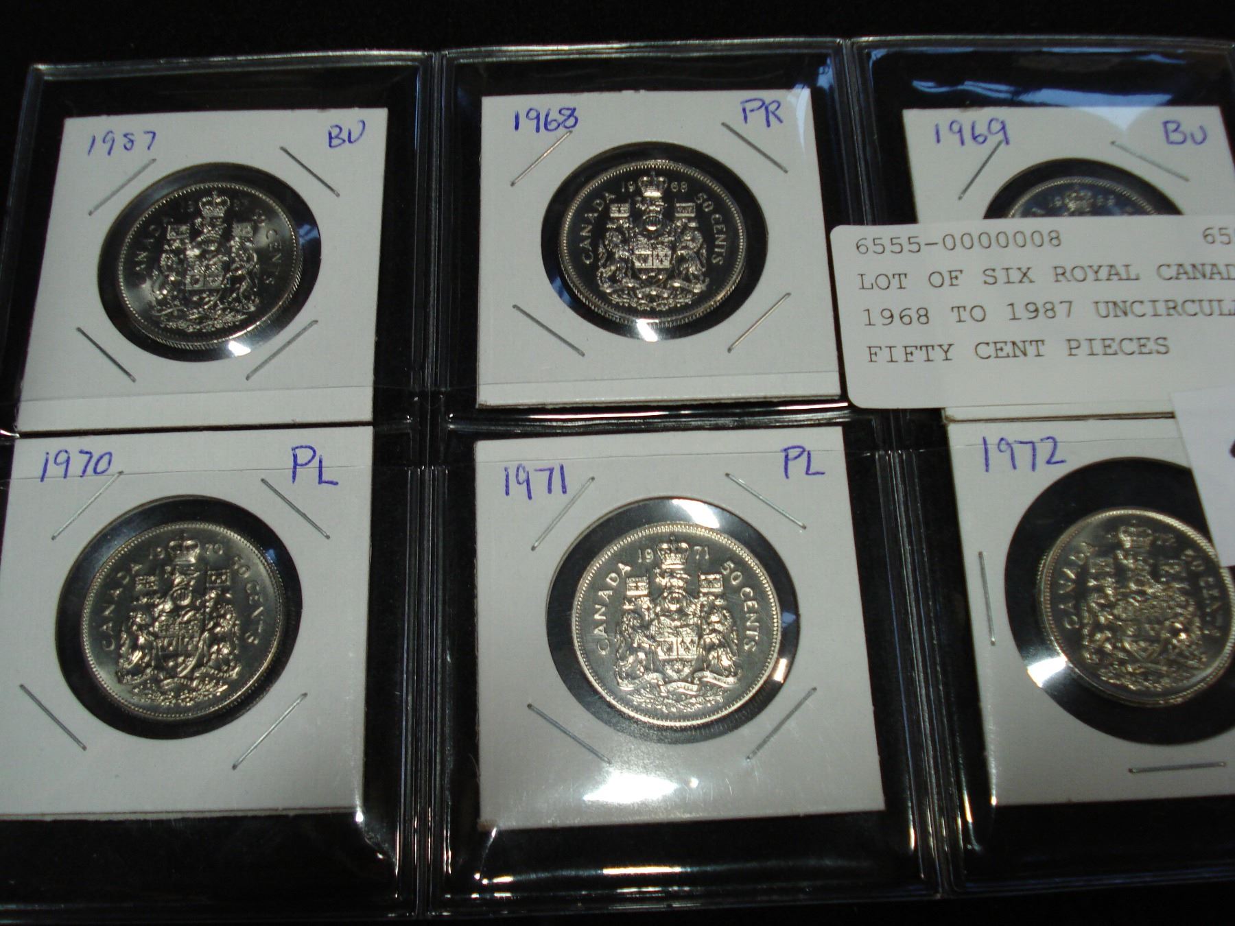 LOT OF SIX ROYAL CANADIAN MINT 1968 TO 1987 UNCIRCULATED FIFTY CENT PIECES