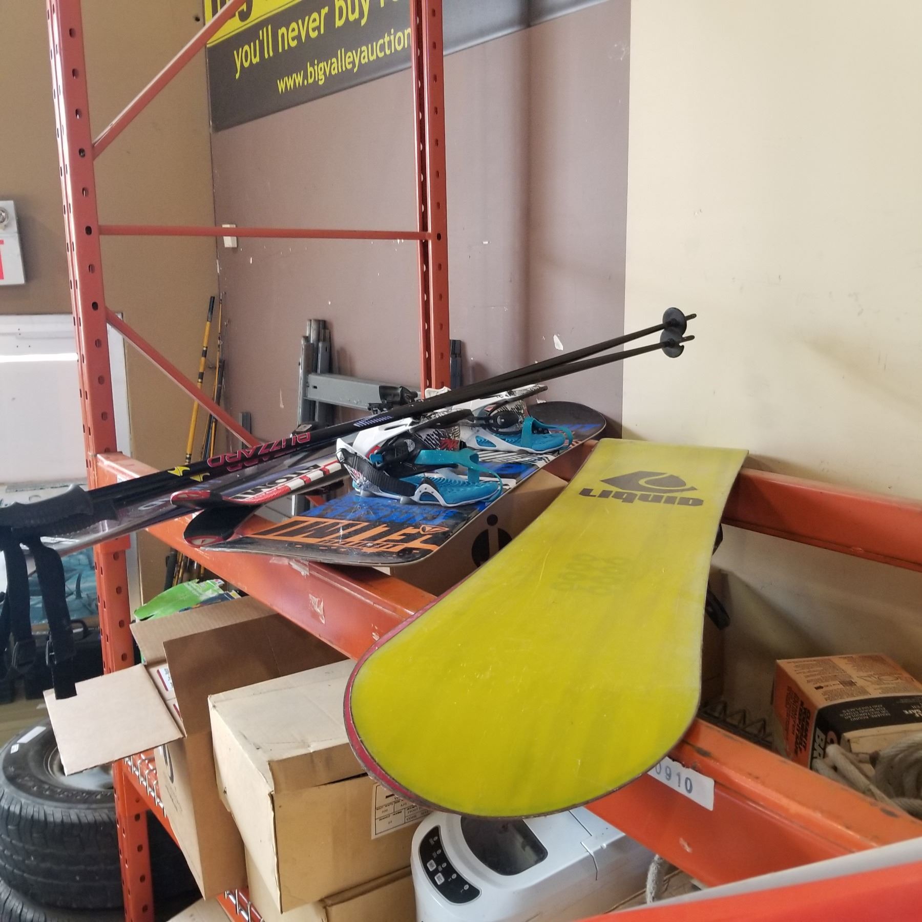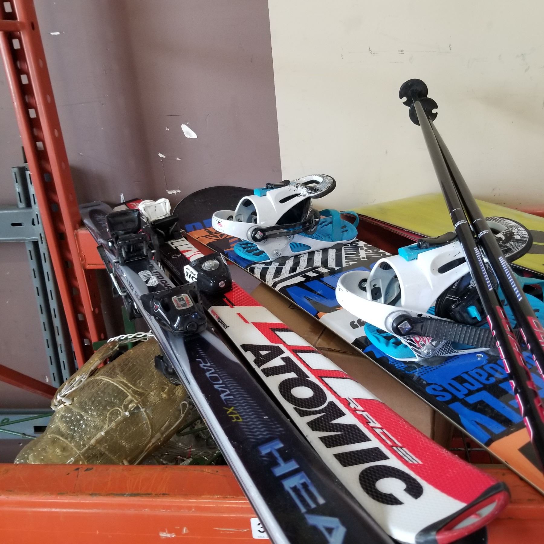 LOT OF SKIS AND SNOWBOARDS