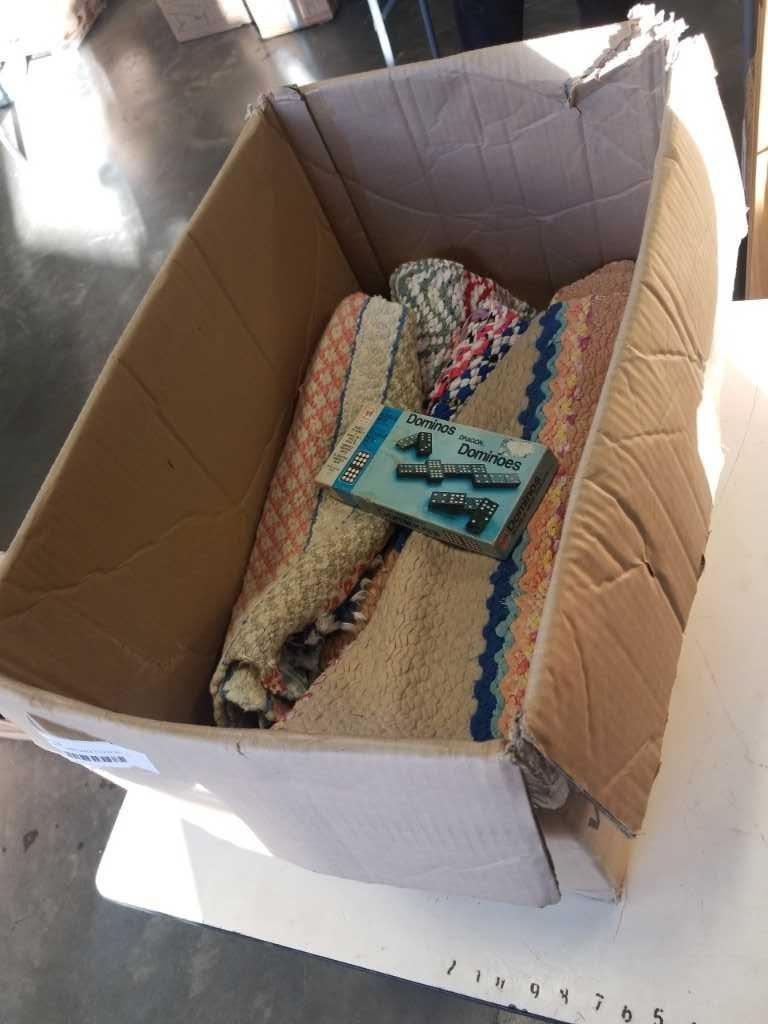 LOT OF SMALL HAND MADE FLOOR MATTS, AND VINTAGE DOMINOS