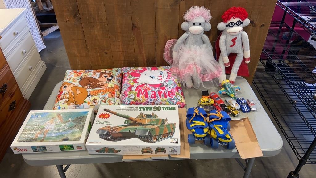 LOT OF SOCK PUPPETS, BEAD PILLOWS, PUZZLES AND MORE