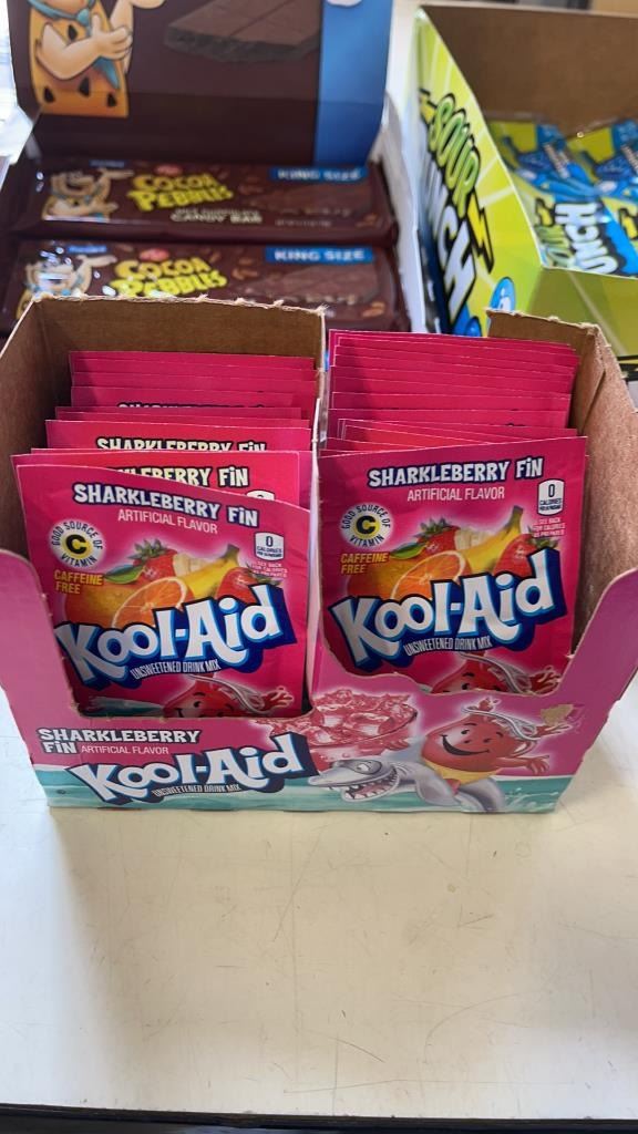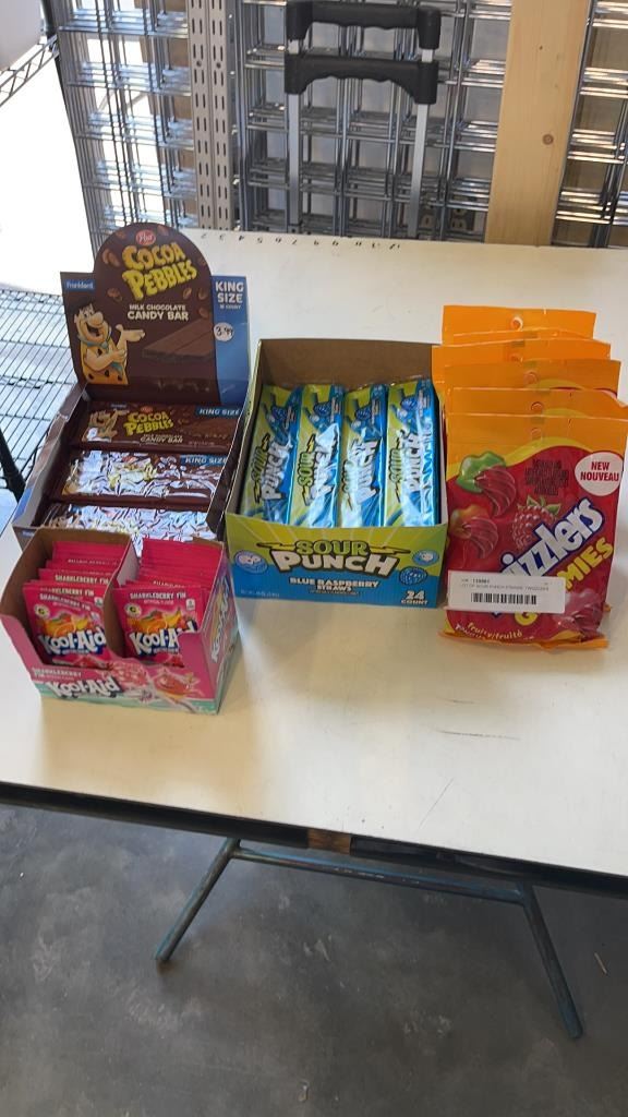 LOT OF SOUR PUNCH STRAWS, TWIZZLERS GUMMIES, COCOA PEBBLES CANDY BARS AND KOOLAID DRINK MIX - BB APR 2023