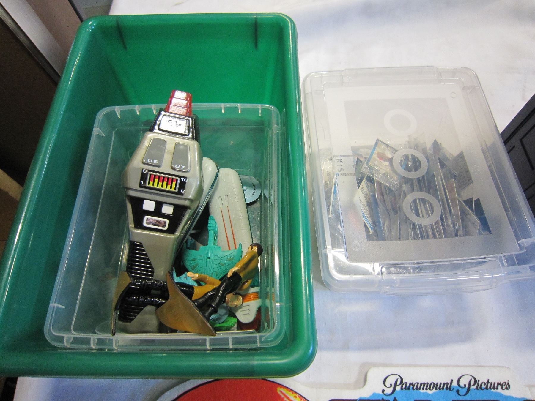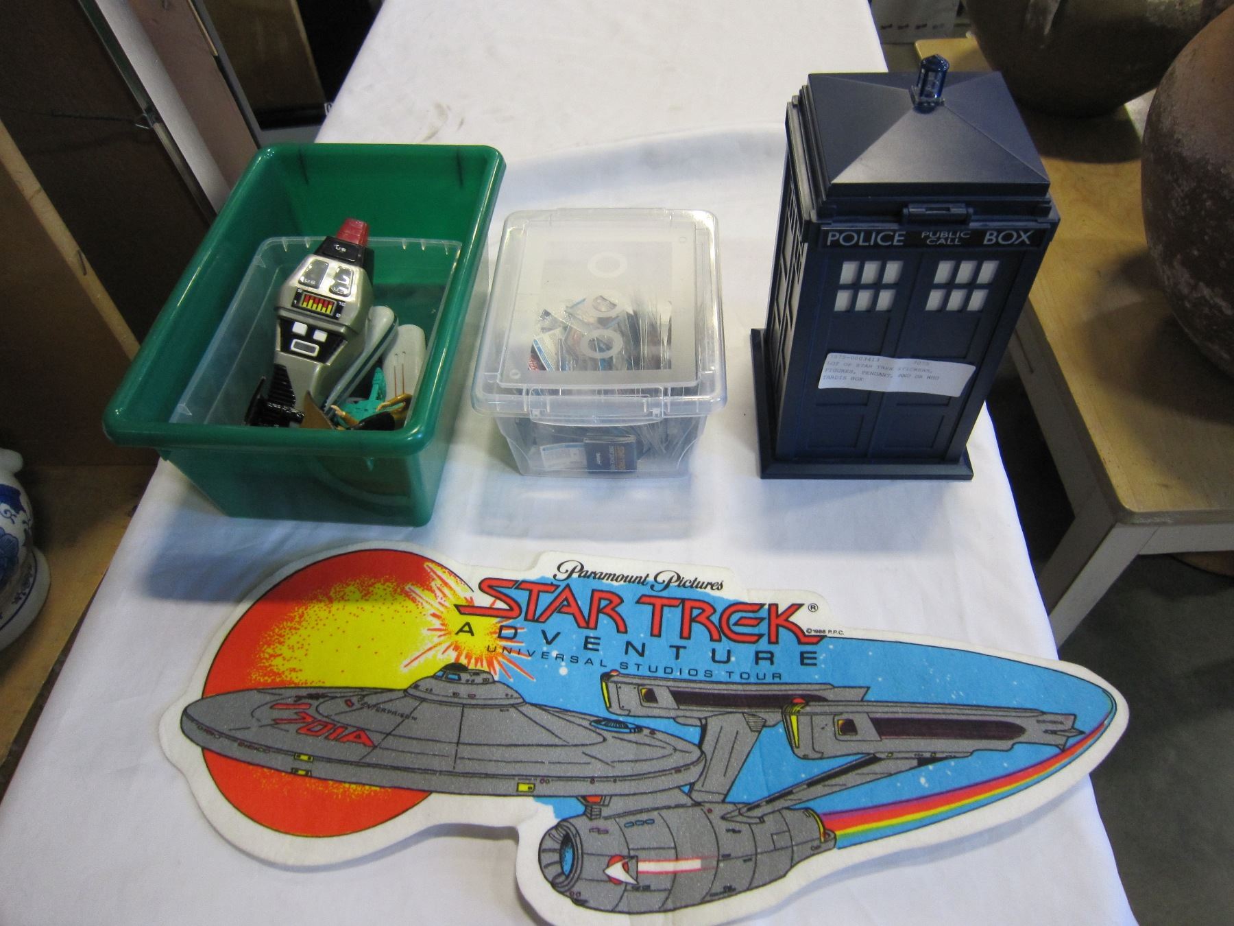 LOT OF STAR TREK STICKERS, FIGURES, PENDANT, AND DR WHO TARDIS BOX