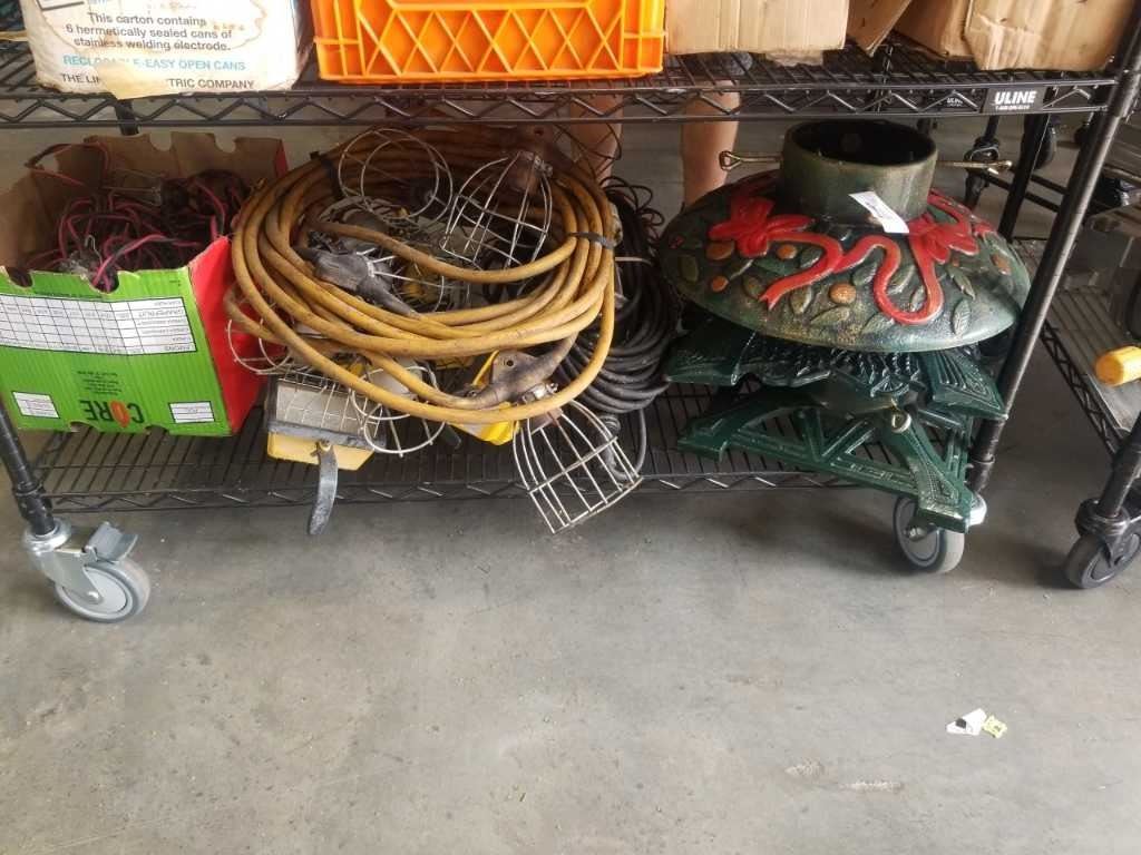 LOT OF STRING LIGHTS AND 3 CAST IRON STANDS