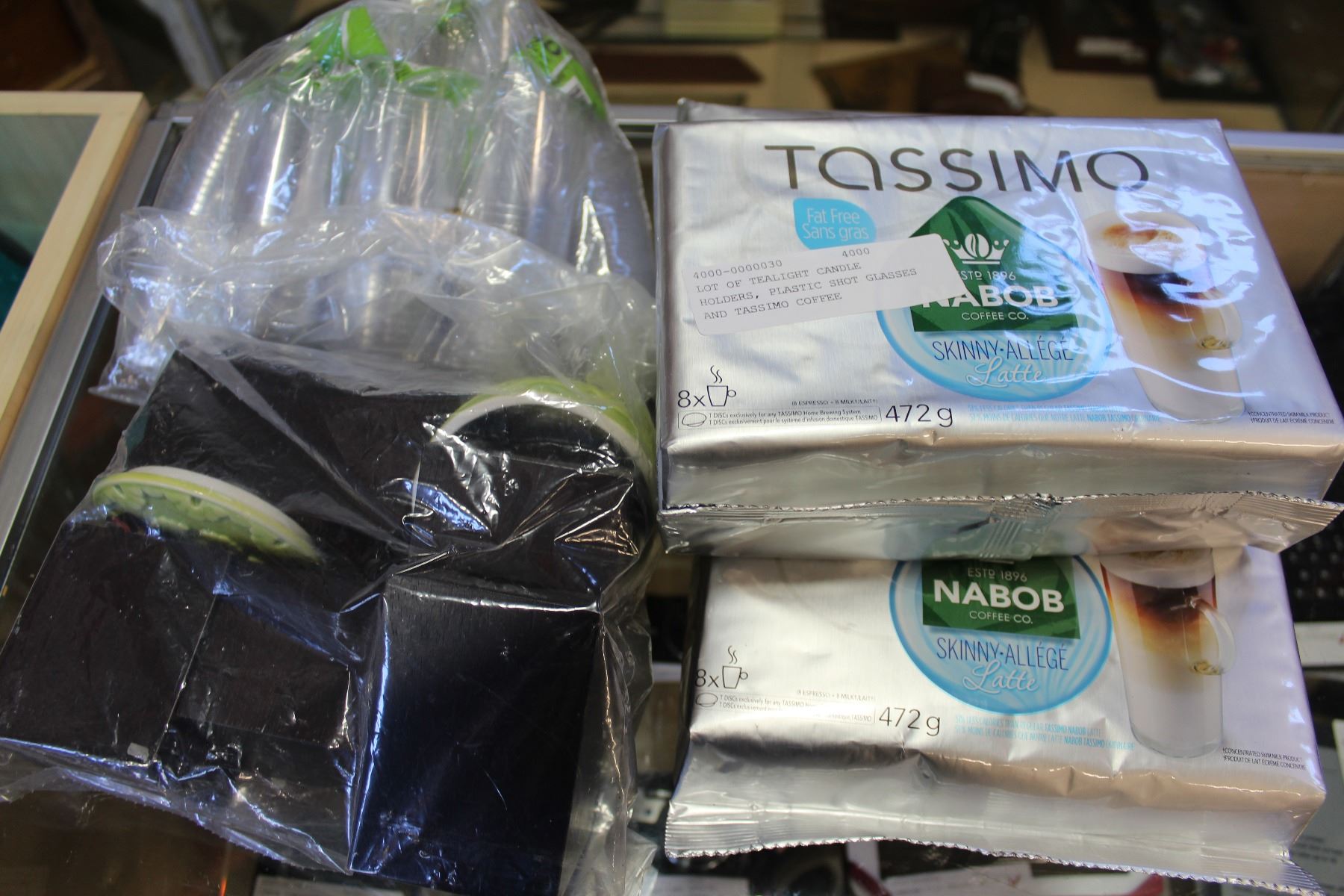 LOT OF TEALIGHT CANDLE HOLDERS, PLASTIC SHOT GLASSES AND TASSIMO COFFEE