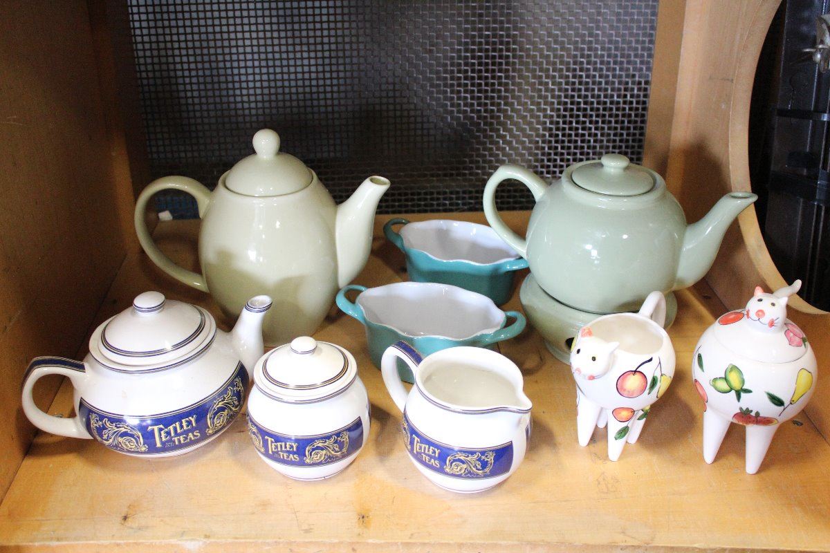 LOT OF TEAPOTS AND CREAM AND SUGARS