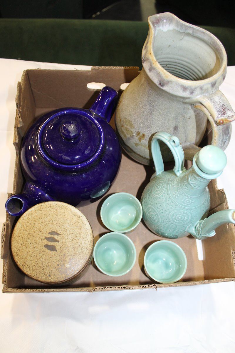 LOT OF TEAPOTS AND STONEWARE JUG ETC