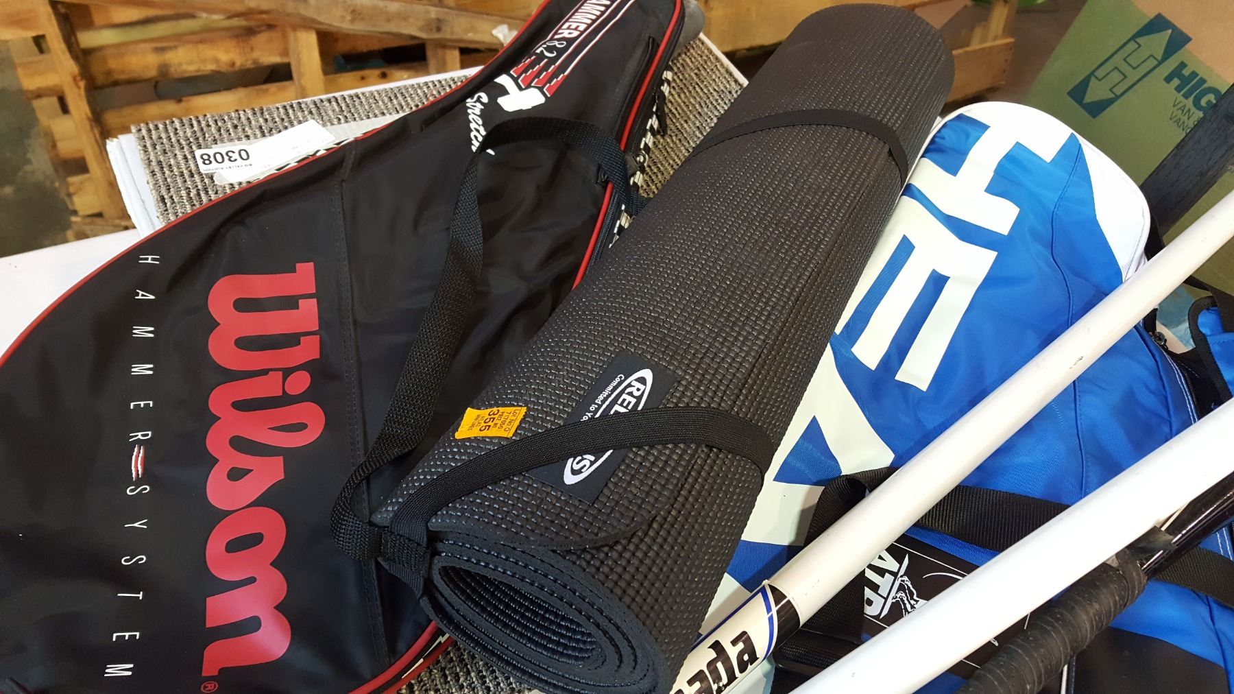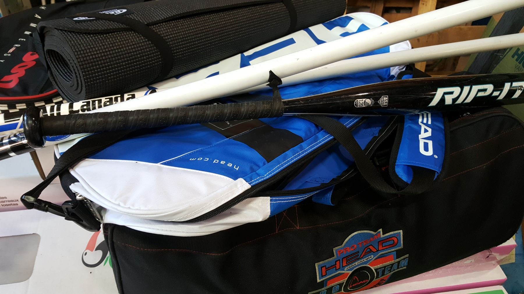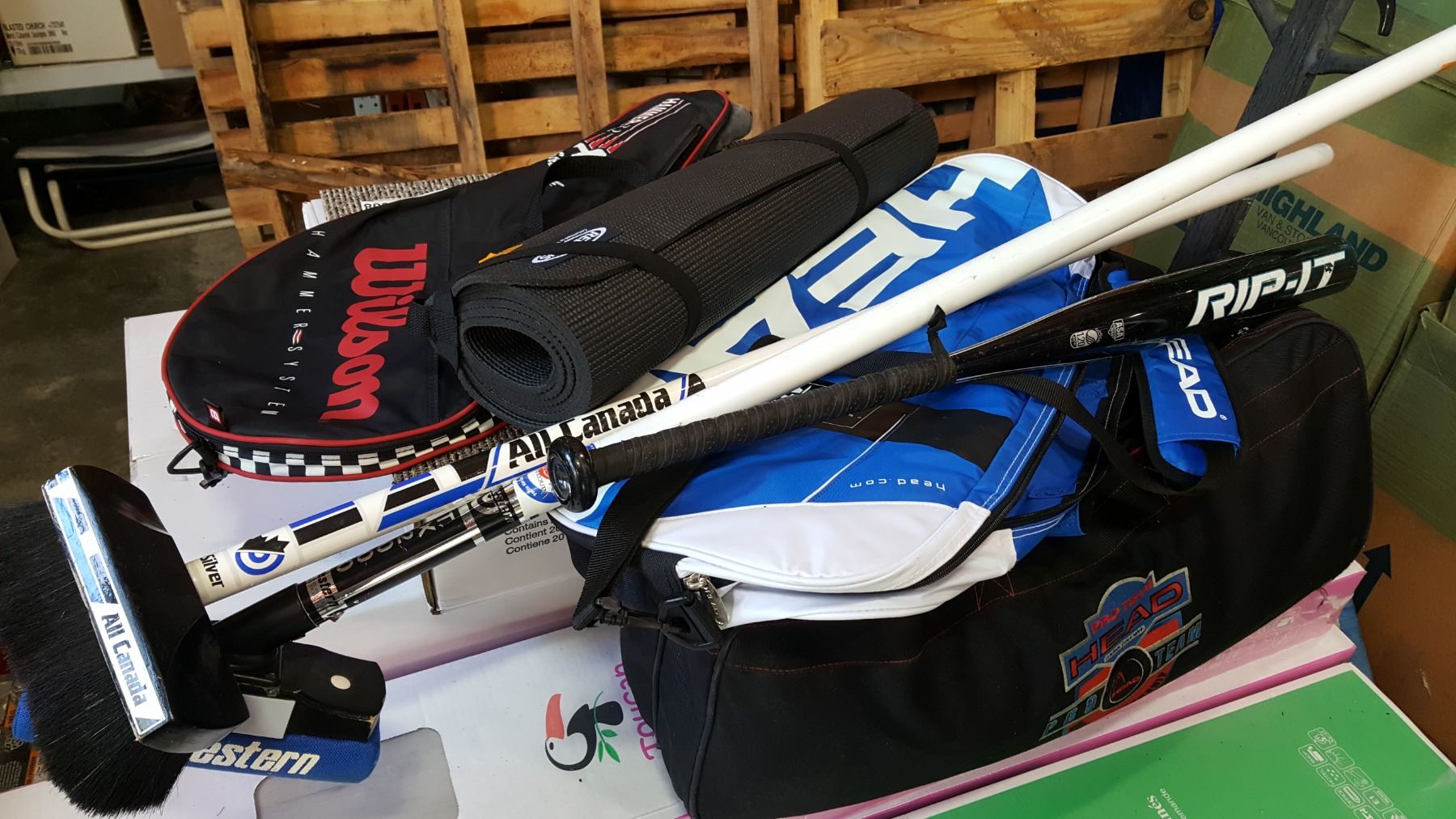 LOT OF TENNIS RACQUETS BAGS AND DUMBELLS WITH CURL BROOMS