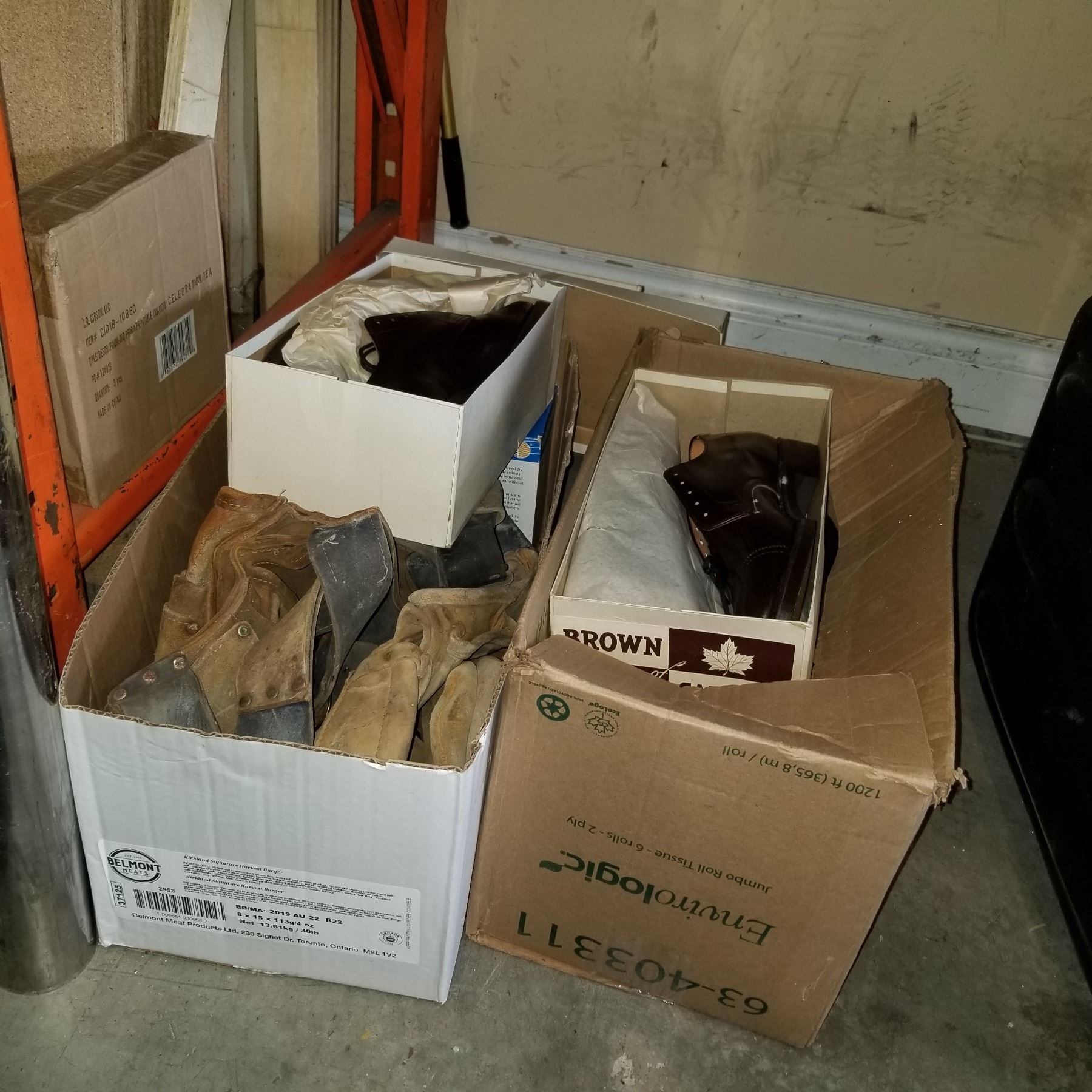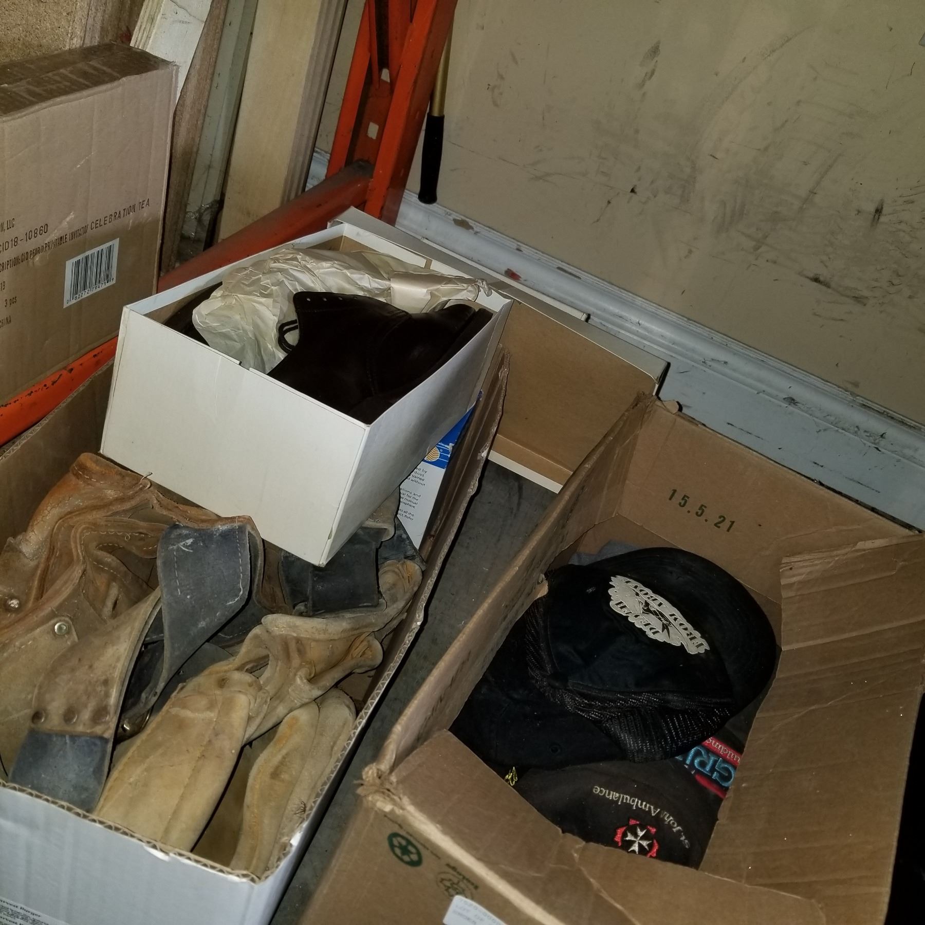 LOT OF TOOL BELTS, LEATHER SHOES, AND HATS