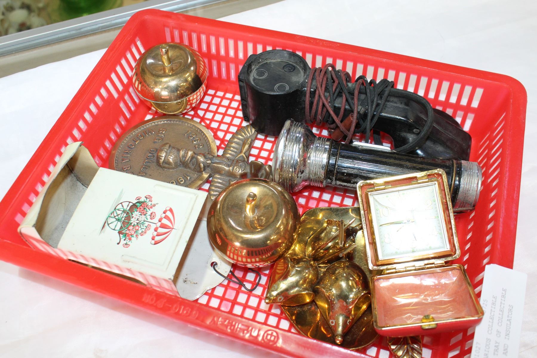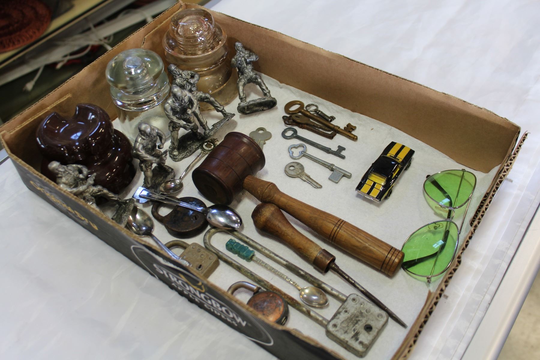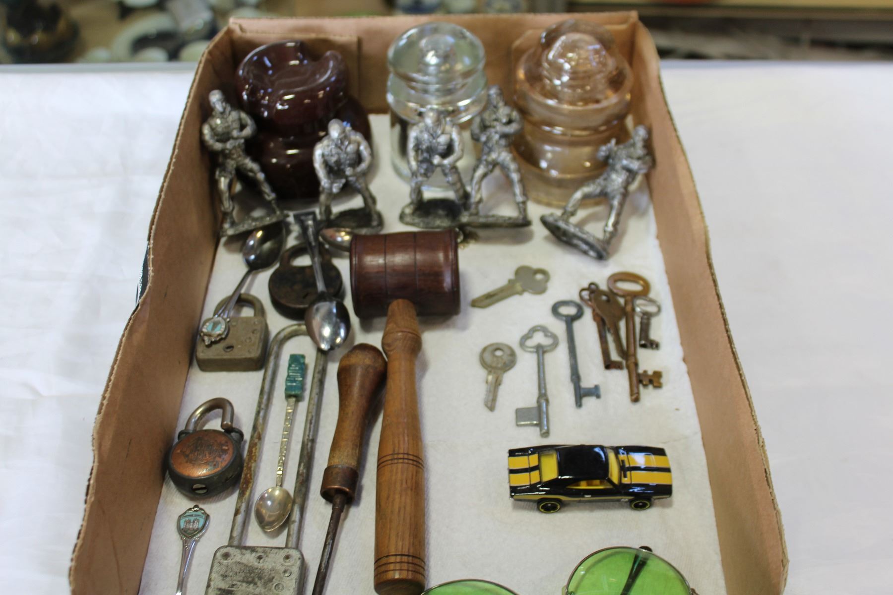 LOT OF VARIOUS COLLECTIBLE ITEMS AND TRAY OF COLLECTIBLE LOCKS KEYS AND INSULATORS