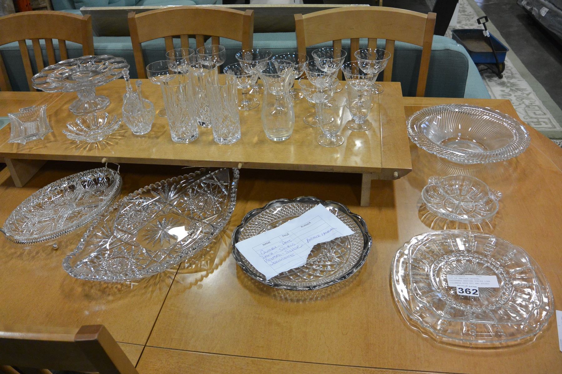 LOT OF VARIOUS CRYSTAL PATTERNED SERVING PIECES LIKE COLUMBIA DOTS ETC AND ETCHED CORNFLOWER STEMWARE