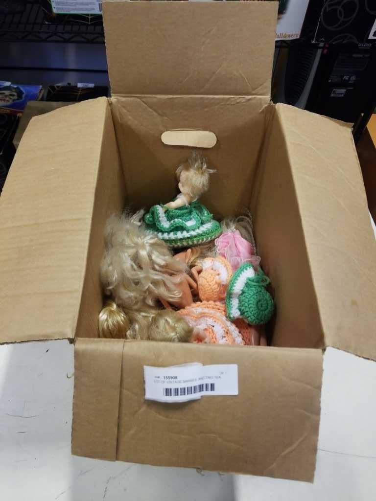 LOT OF VINTAGE BARBIES, AND TWO TEA CUP KNITTED DOLLS