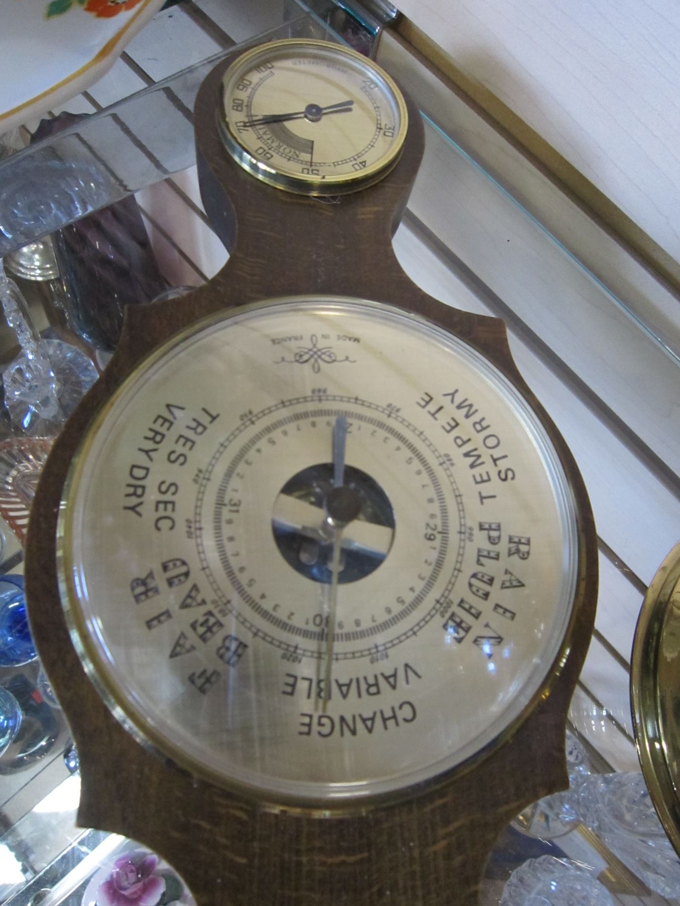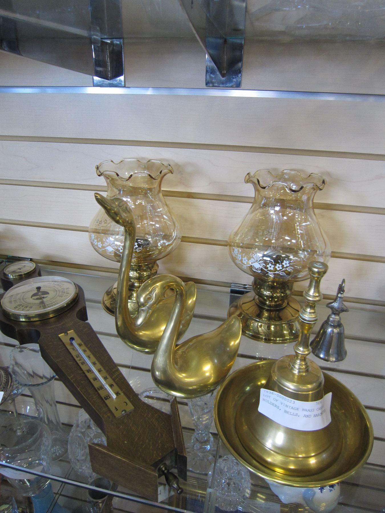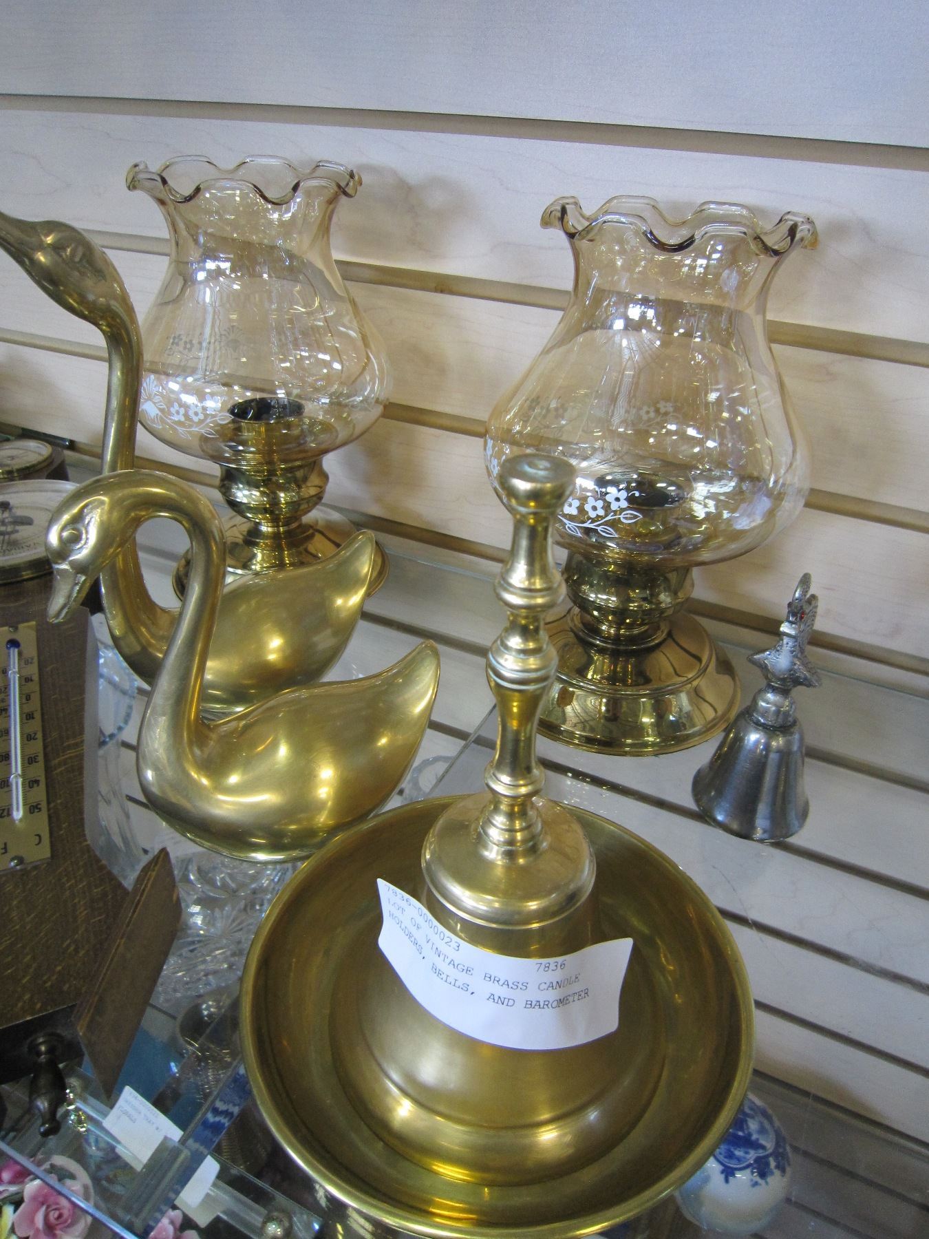 LOT OF VINTAGE BRASS CANDLE HOLDERS, BELLS, AND BAROMETER