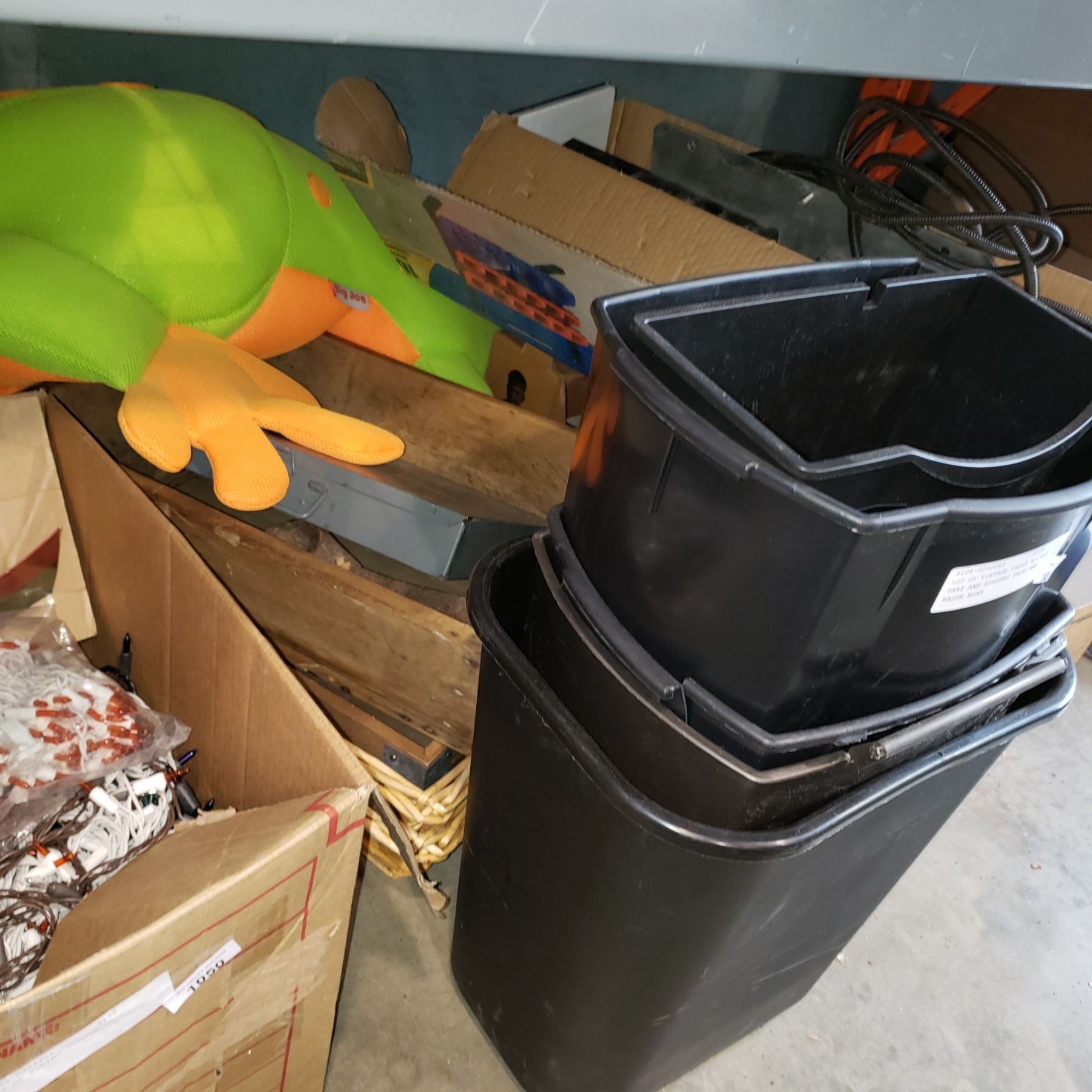 LOT OF VINTAGE TRAYS WICKER TRAY AND STUFFED FROG AND WASTE BINS