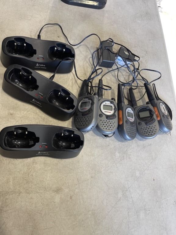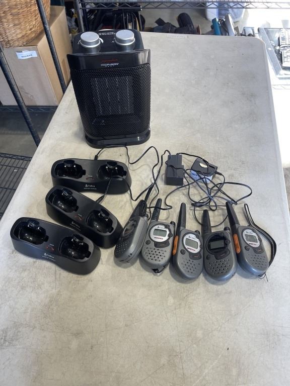 LOT OF WALKIE TALKIES AND CHARGERS AND SPACE HEATER