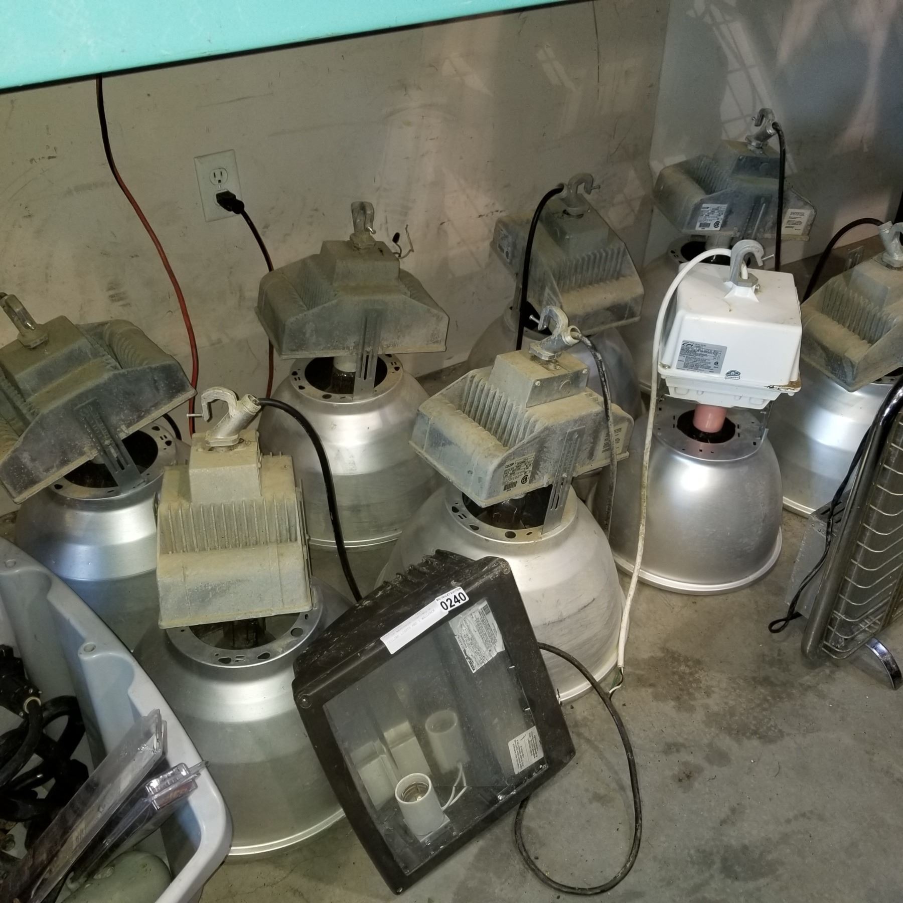 LOT OF WAREHOUSE LIGHTING, 8 CEILING LIGHTS AND 1 WALLPACK