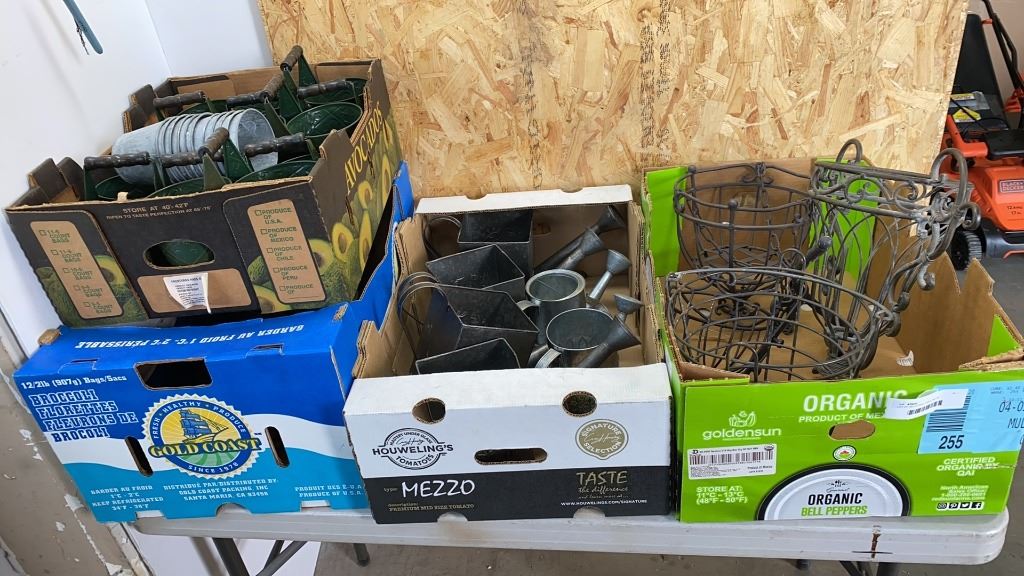 LOT OF WATERING CANS, METAL PLANTERS, WIRE PLANTER HOLDERS