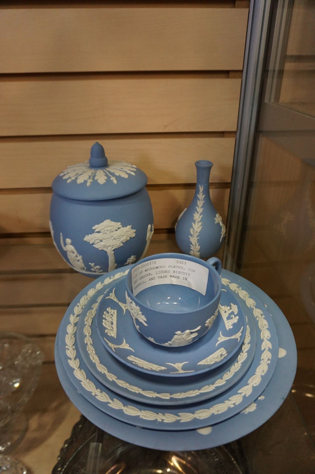 LOT OF WEDGEWOOD PLATES, CUP AND SAUCER, LIDDED BISCUIT BARREL, AND VASE MADE IN ENGLAND