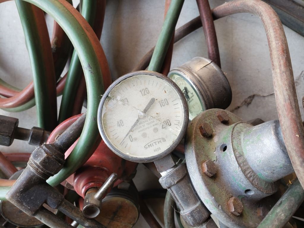LOT OF WELDING GAUGES, HOSES, 2 TORCHES, 2 HELMETS AND JACKET