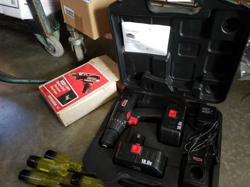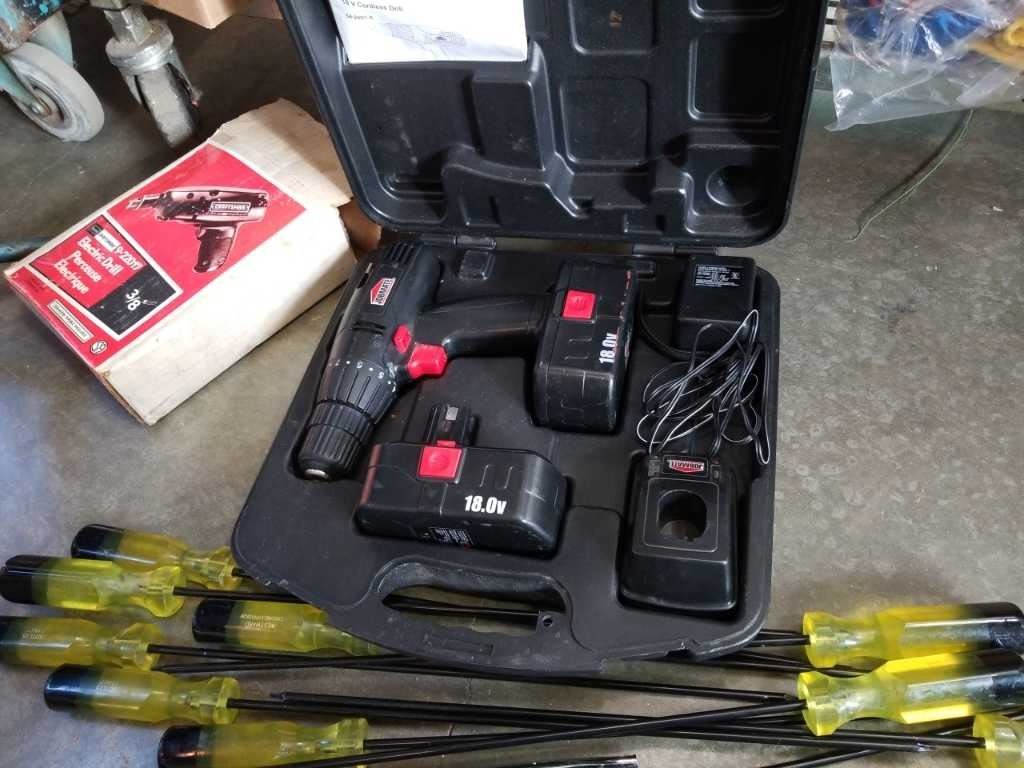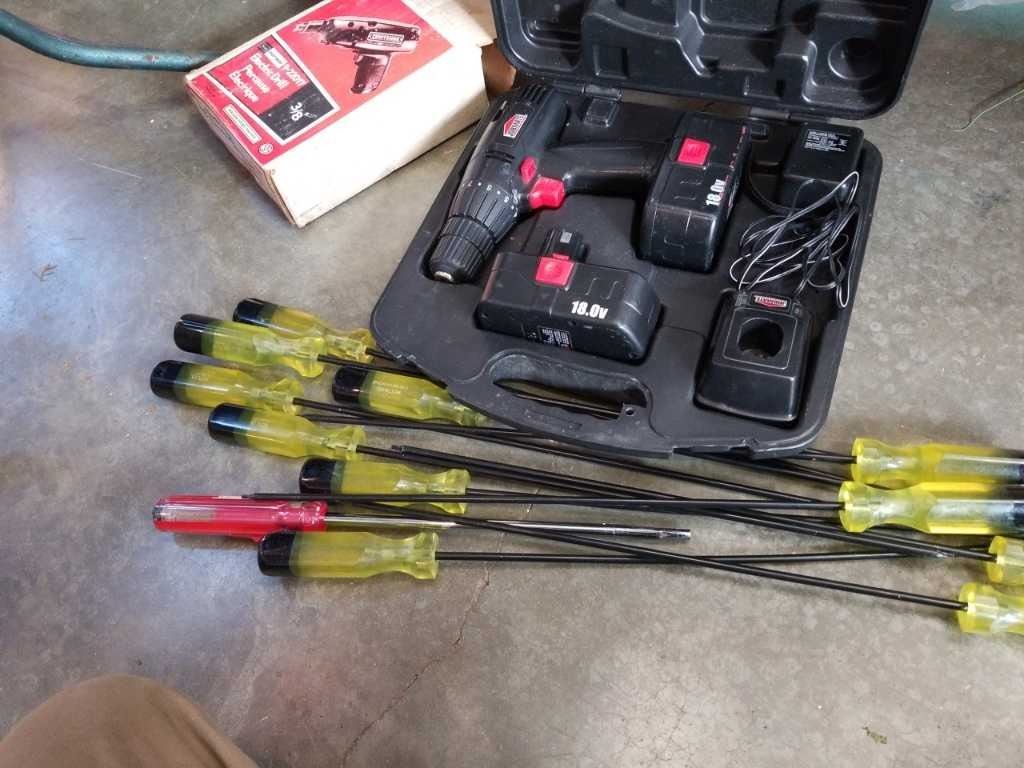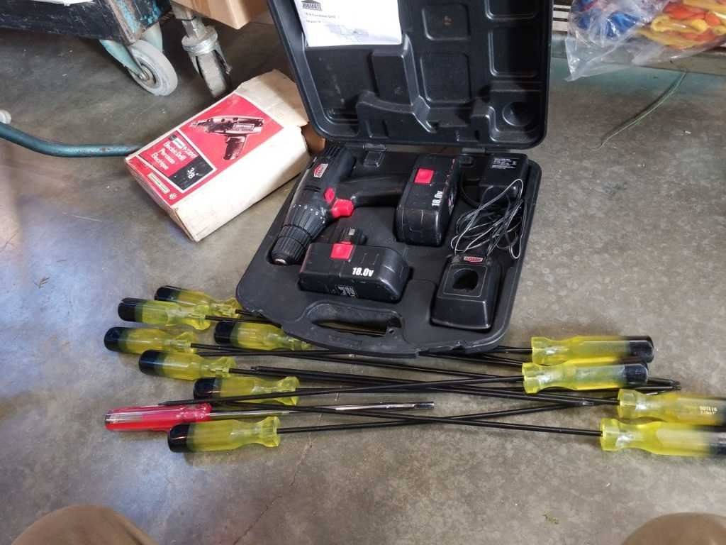 LOT OF WESTWARD LONG SCREWDRIVERS, JOBMATE CORDLESS DRILL, CRAFTSMAN ELECTRIC DRILL