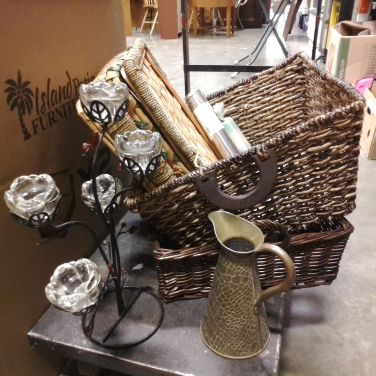 LOT OF WICKER BASKETS AND TEA LIGHT HOLDERS WITH CANDLE AND INSENCE