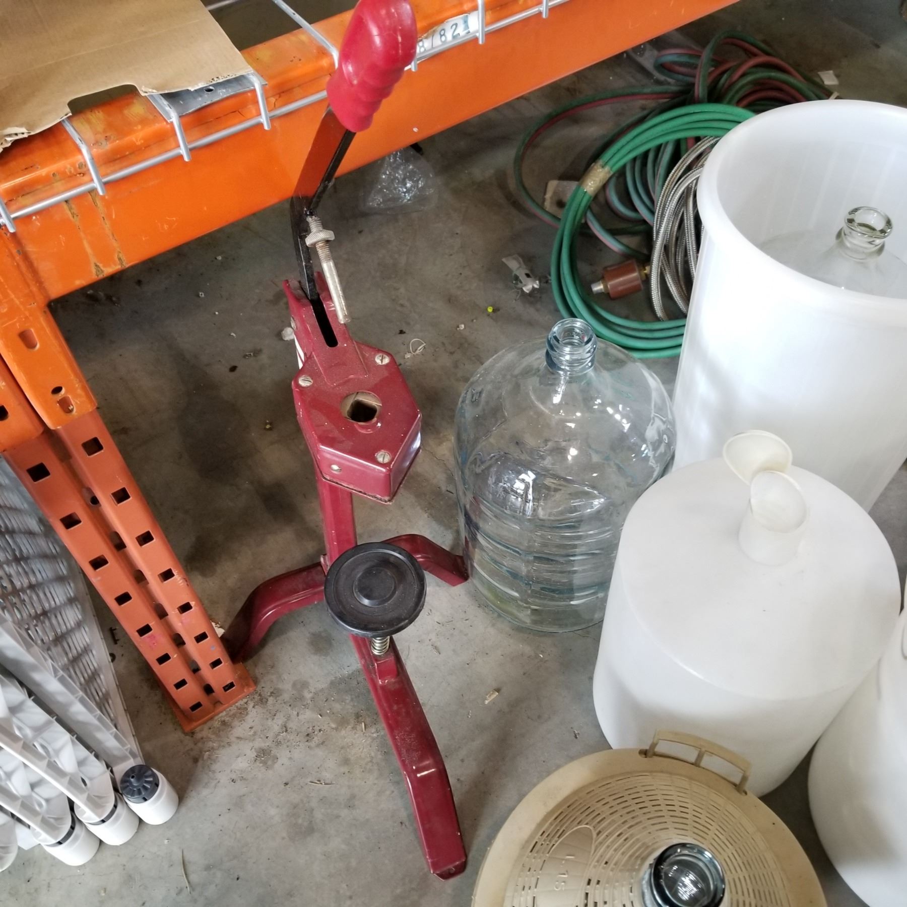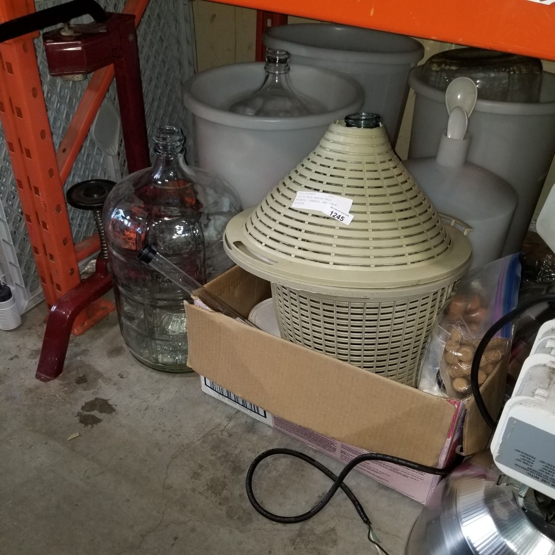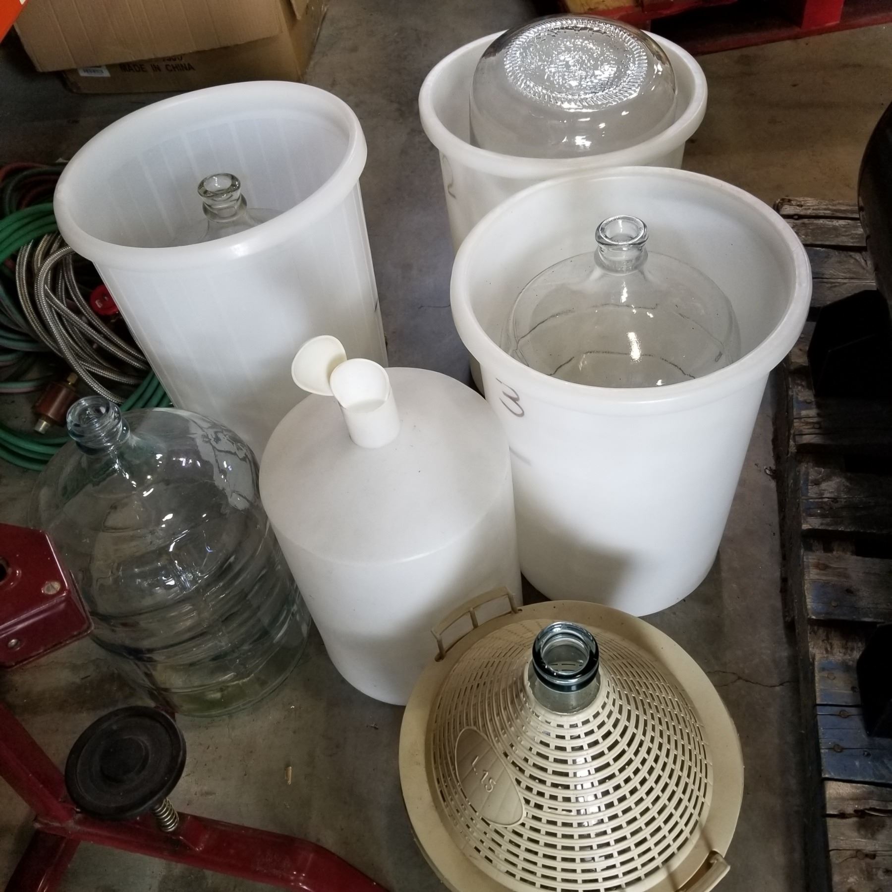 LOT OF WINE MAKING MASH BUCKETS, CARBOYS, AND LARGE BOTTLES