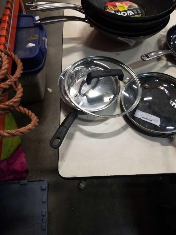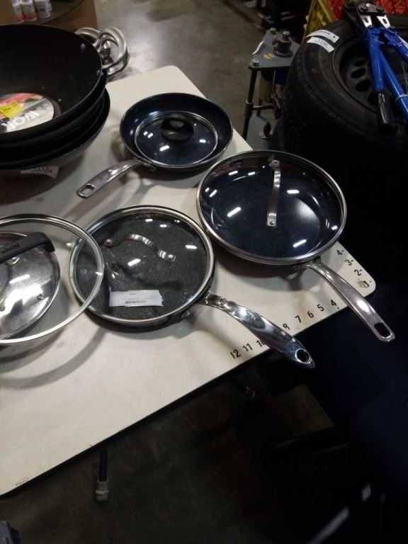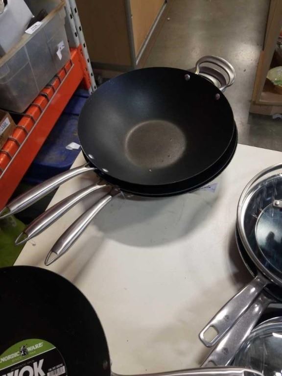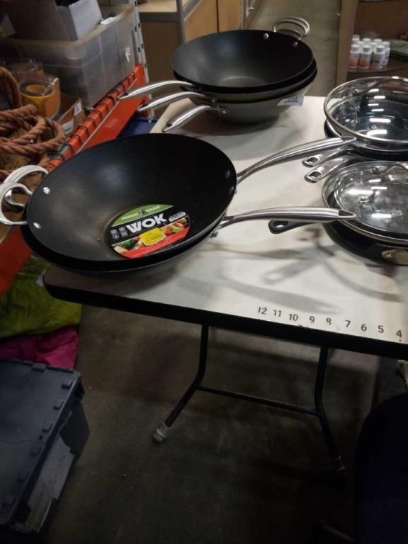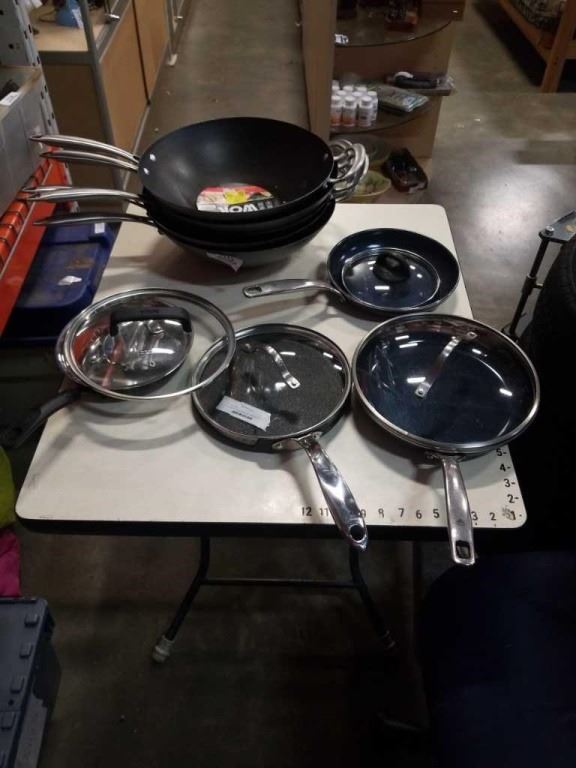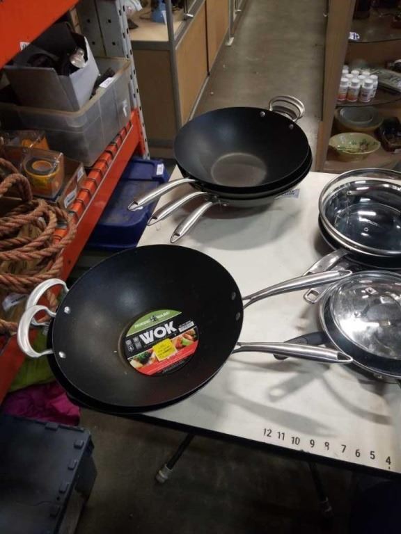 LOT OF WOKS, BLUE DIAMOND PANS AND ROCK CREPE PAN