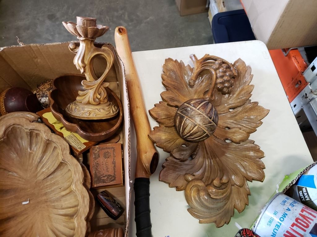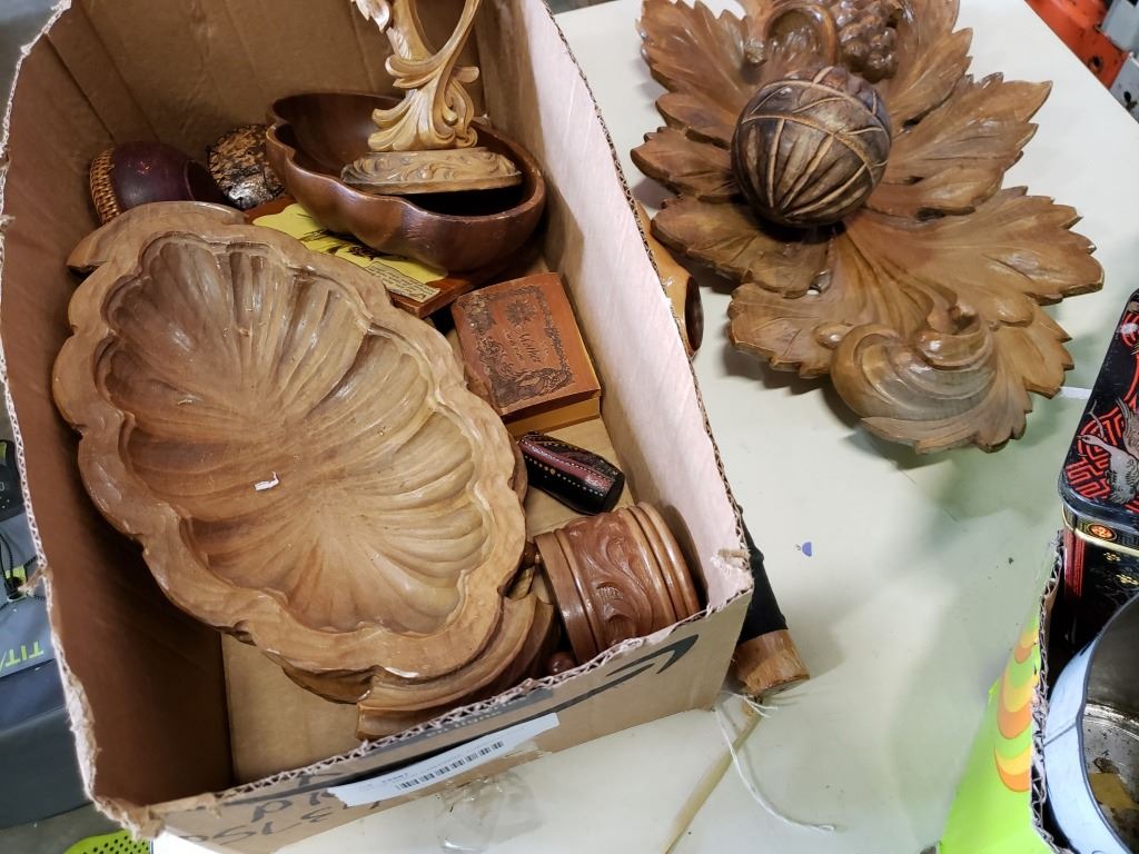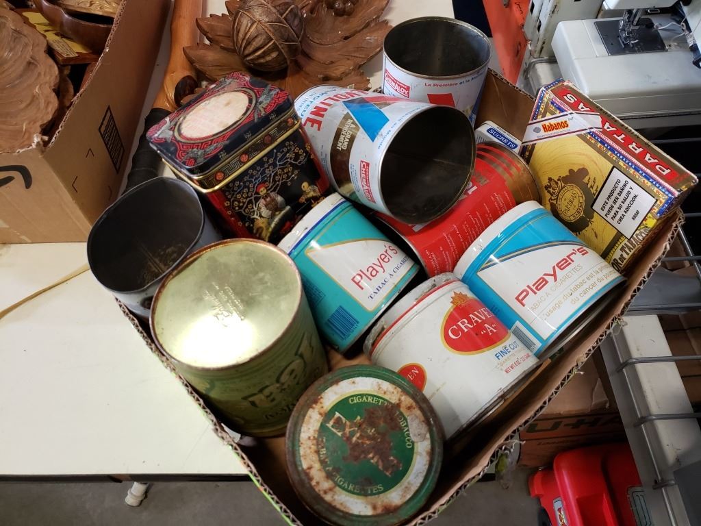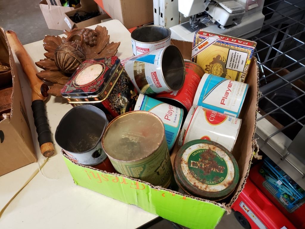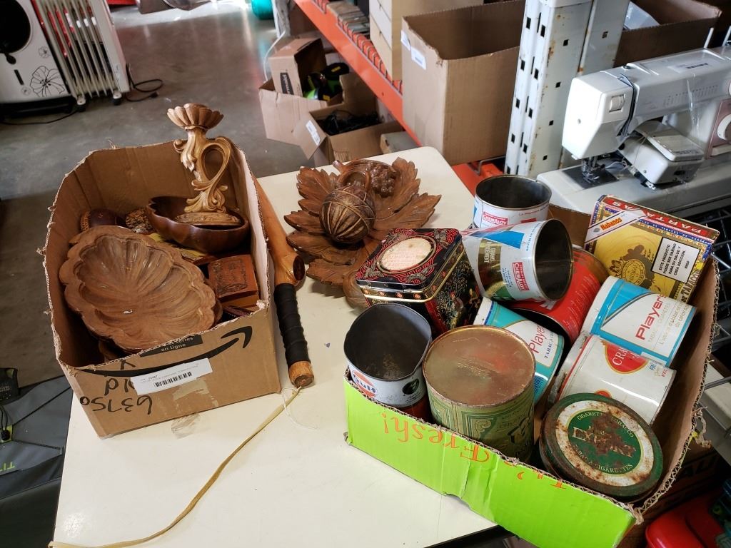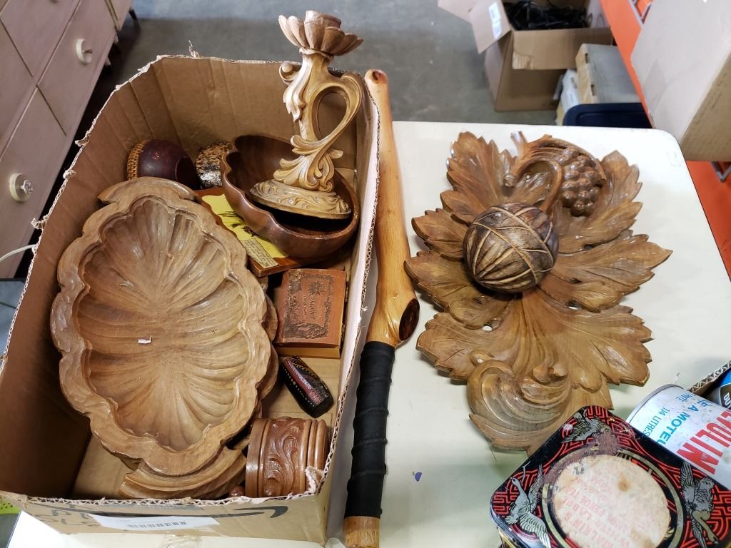 LOT OF WOOD CARVINGS, TOBACCO TINS
