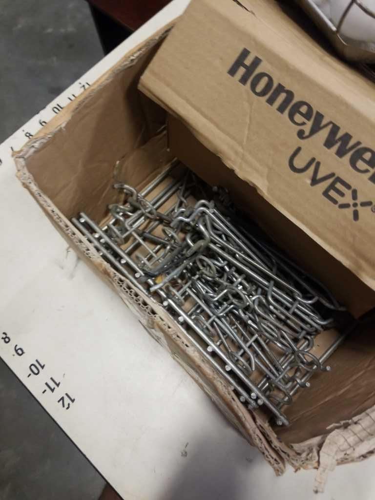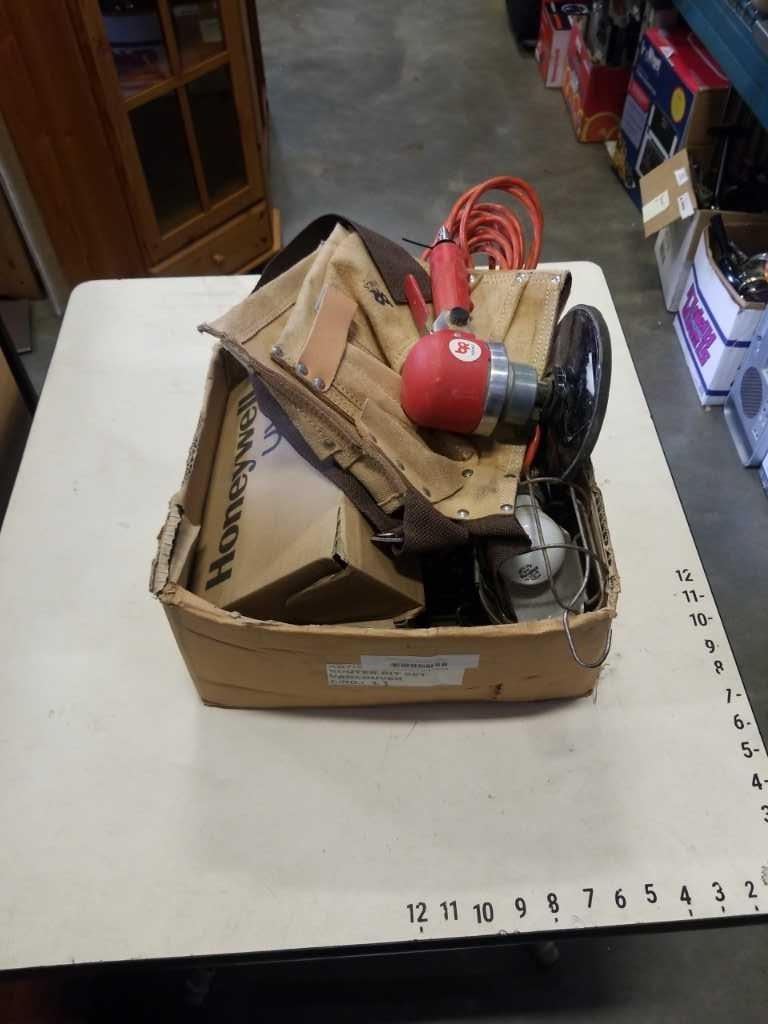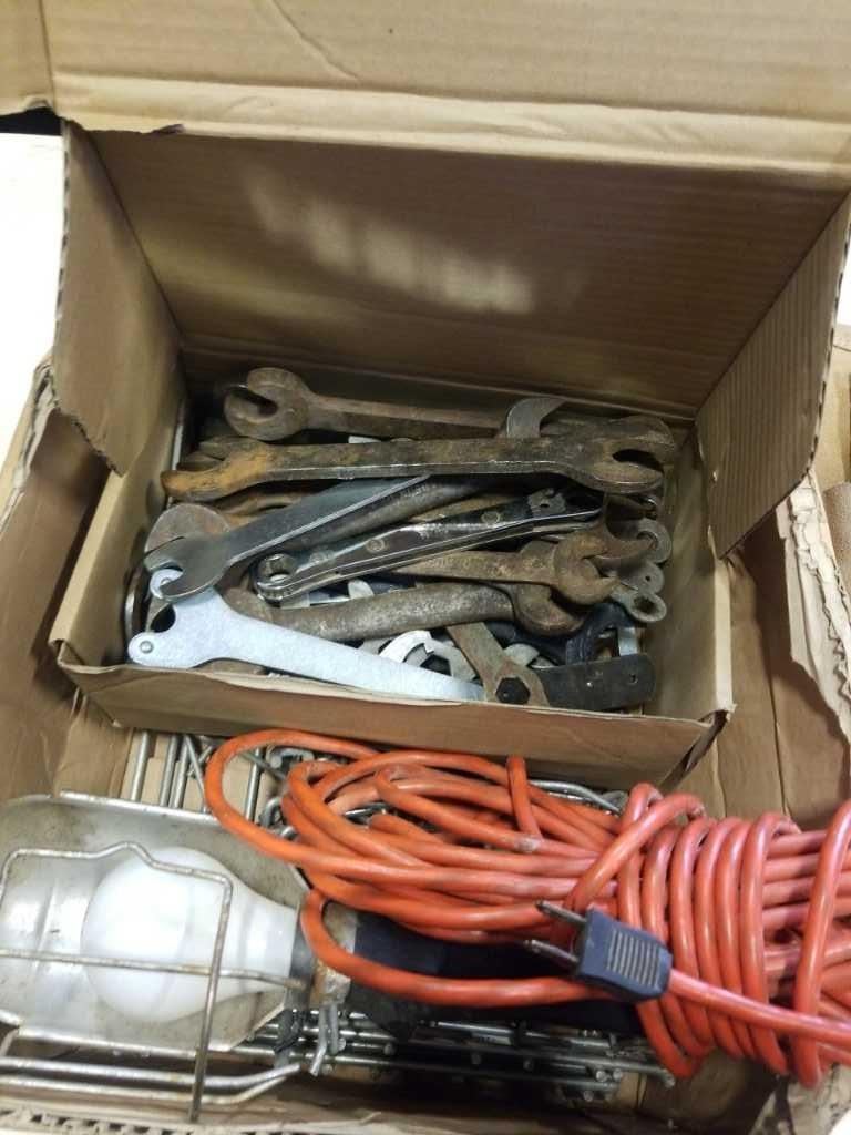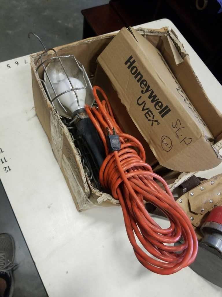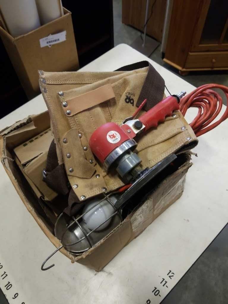 LOT OF WRENCHES, ASSORTED PEGBOARD HOOKS, AIR RANDOM ORBIT SANDER, TROUBLE LIGHT AND TOOLBELT