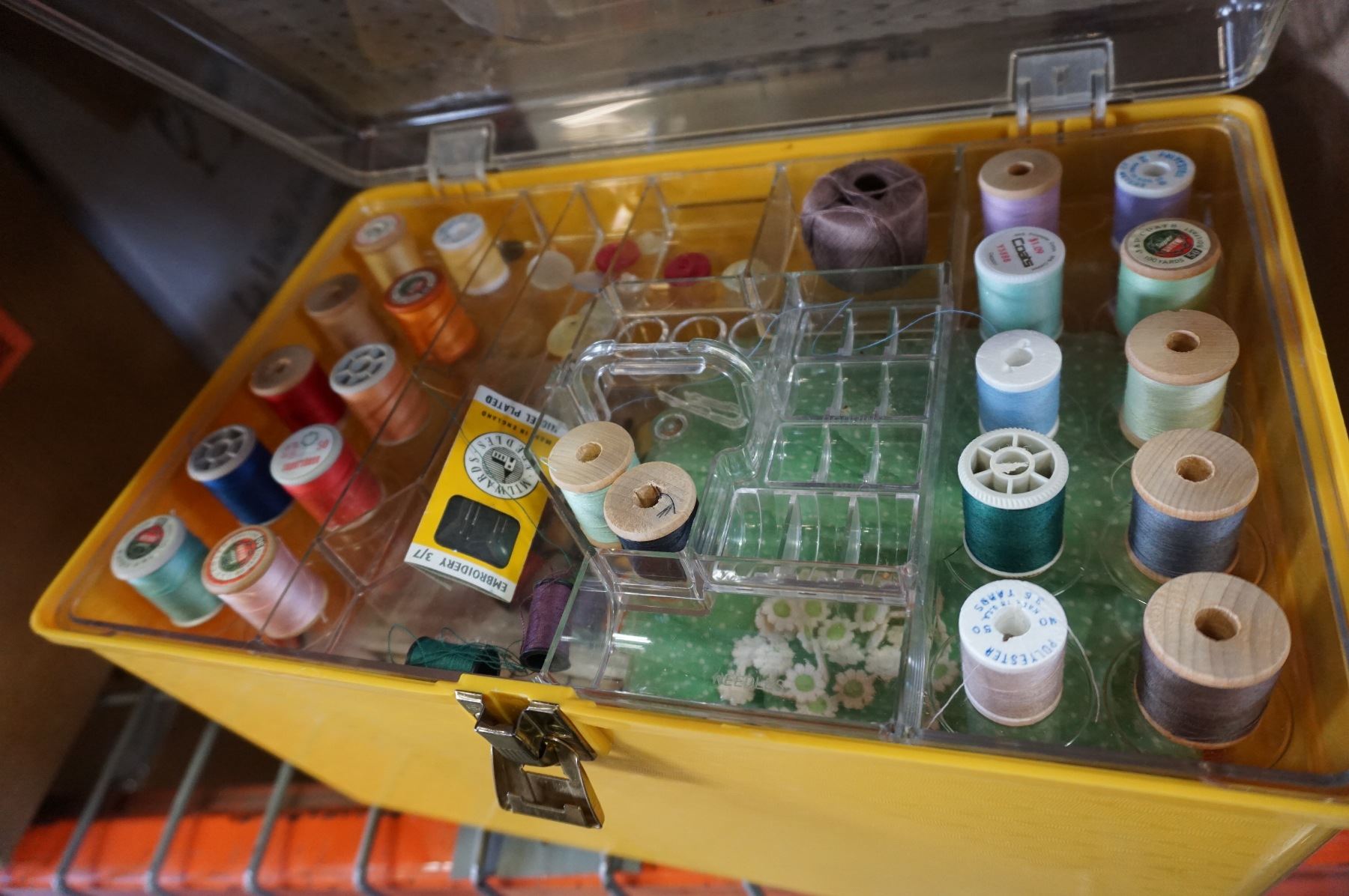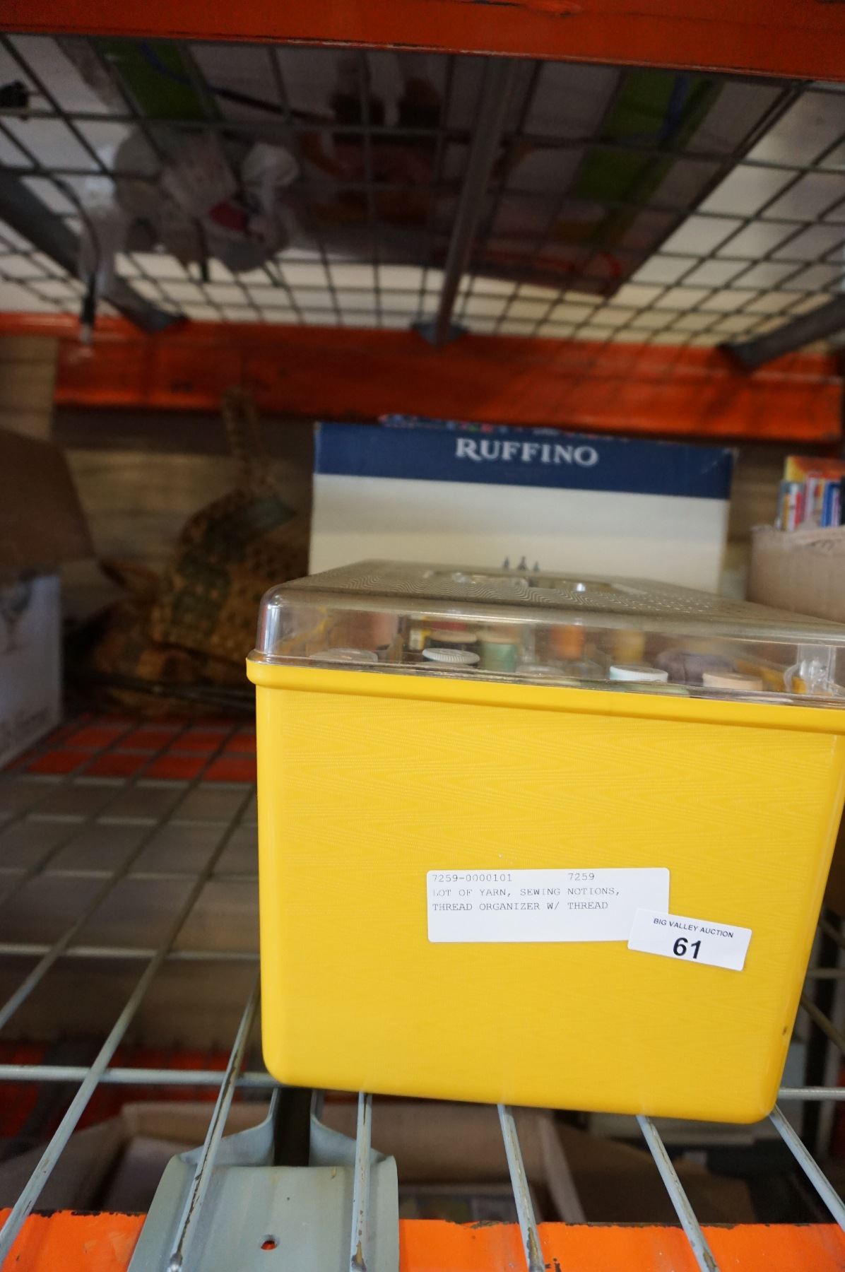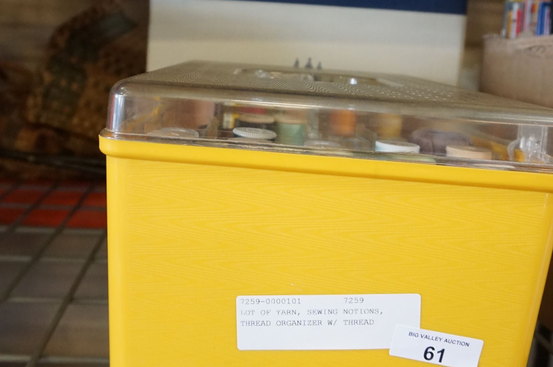 LOT OF YARN, SEWING NOTIONS, THREAD ORGANIZER W/ THREAD