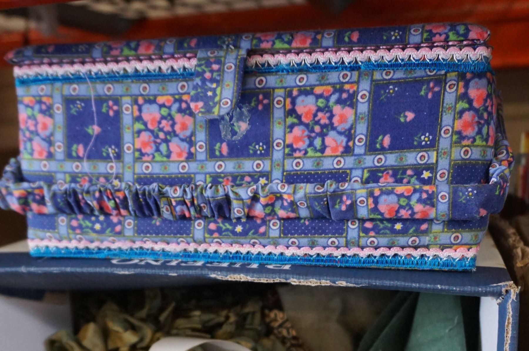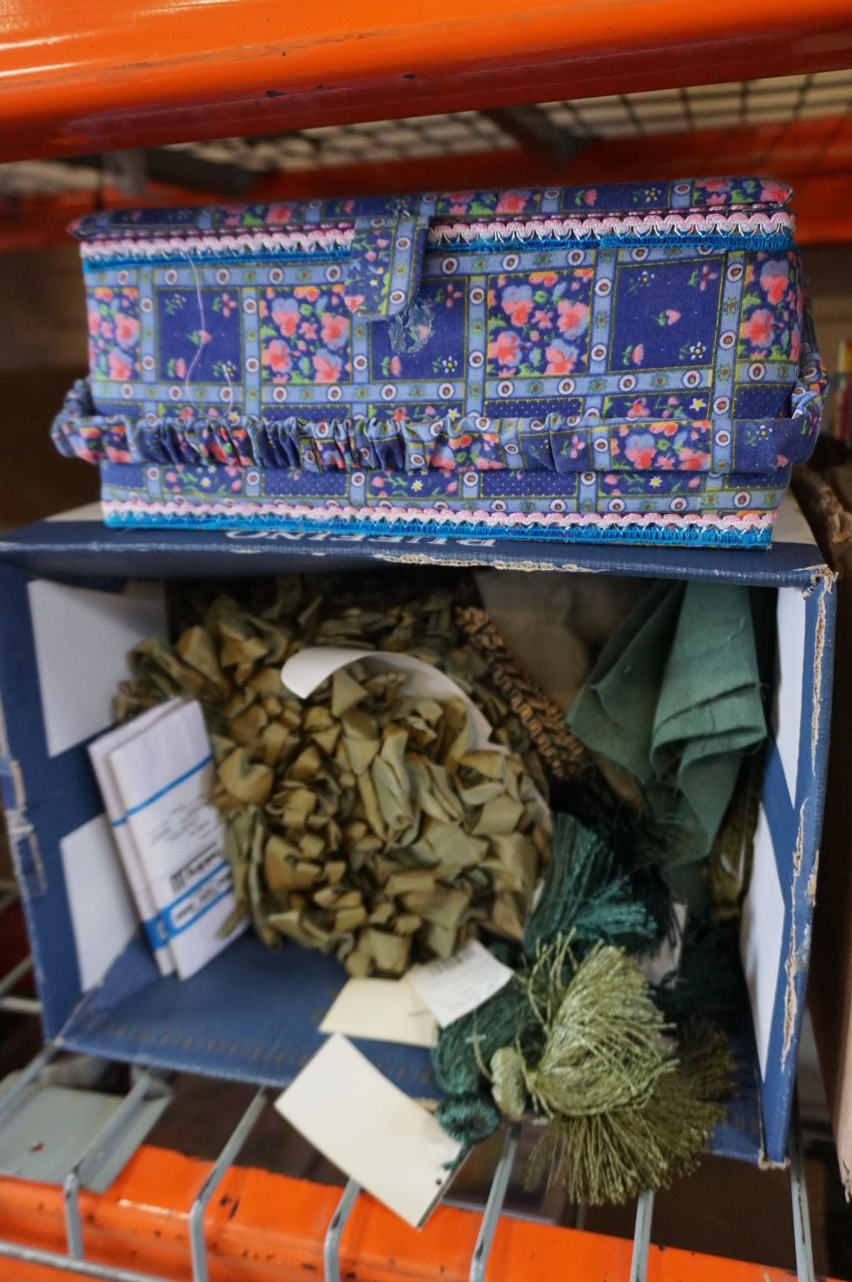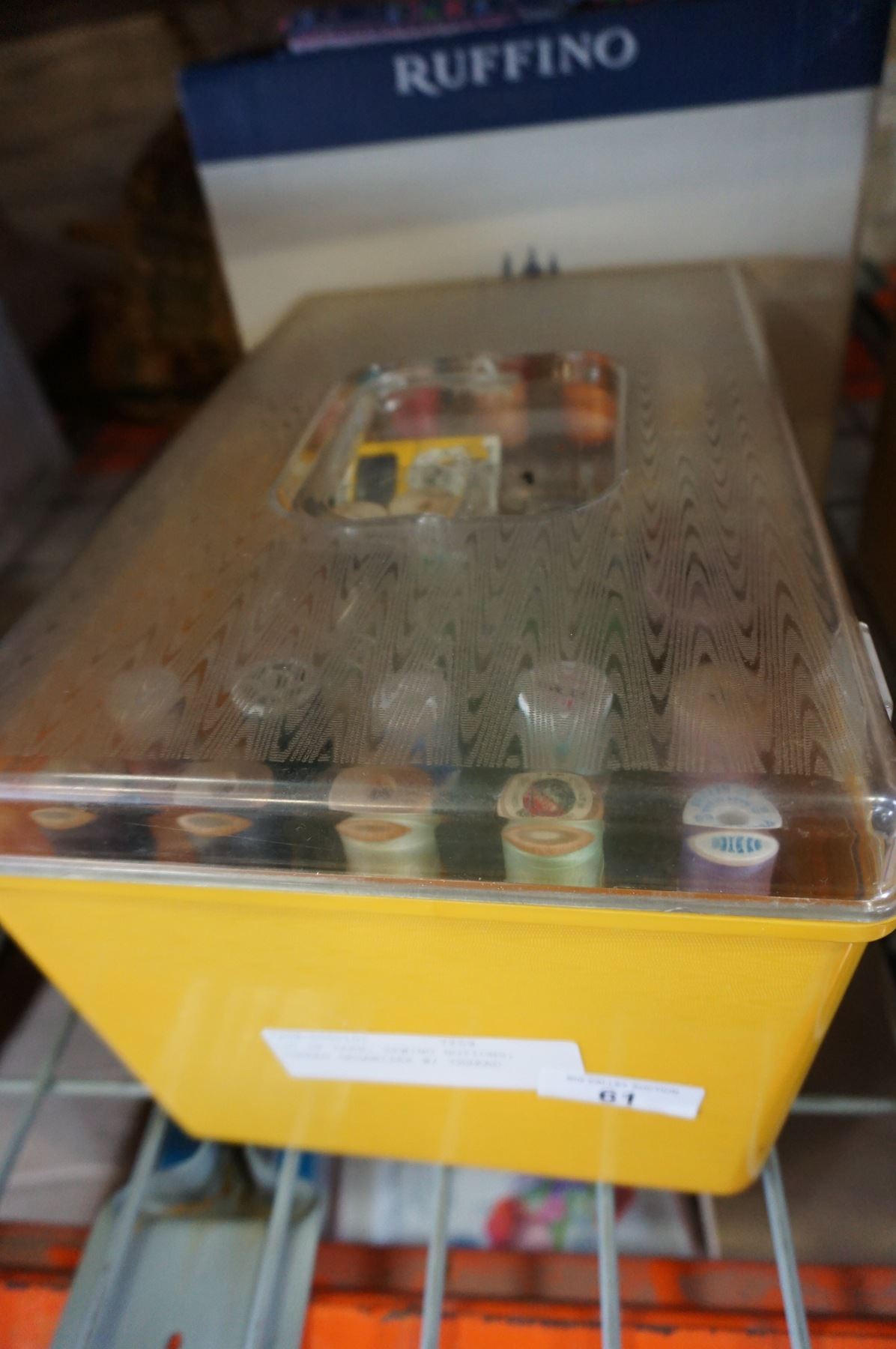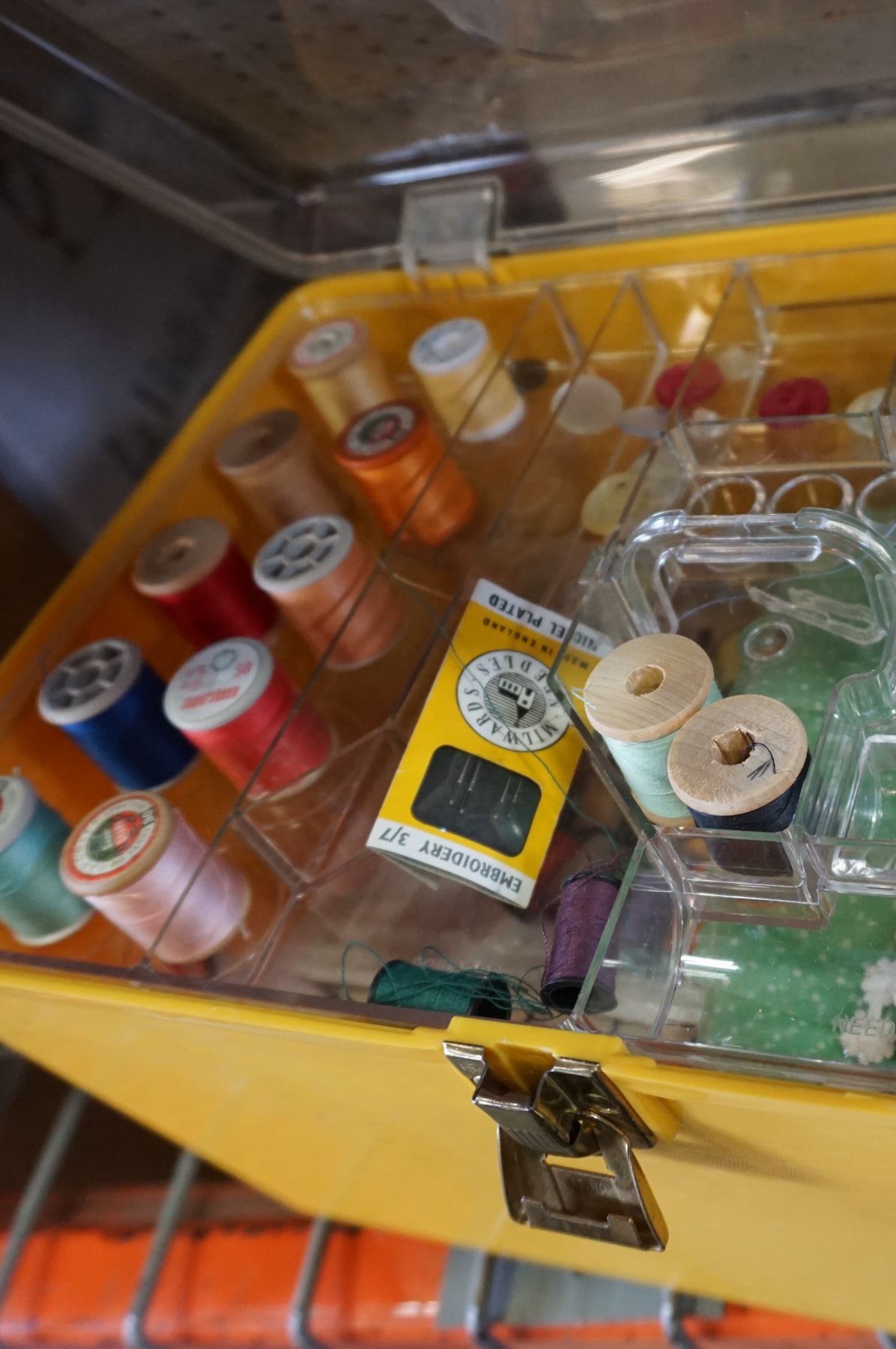 LOT OF YARN, SEWING NOTIONS, THREAD ORGANIZER W/ THREAD
