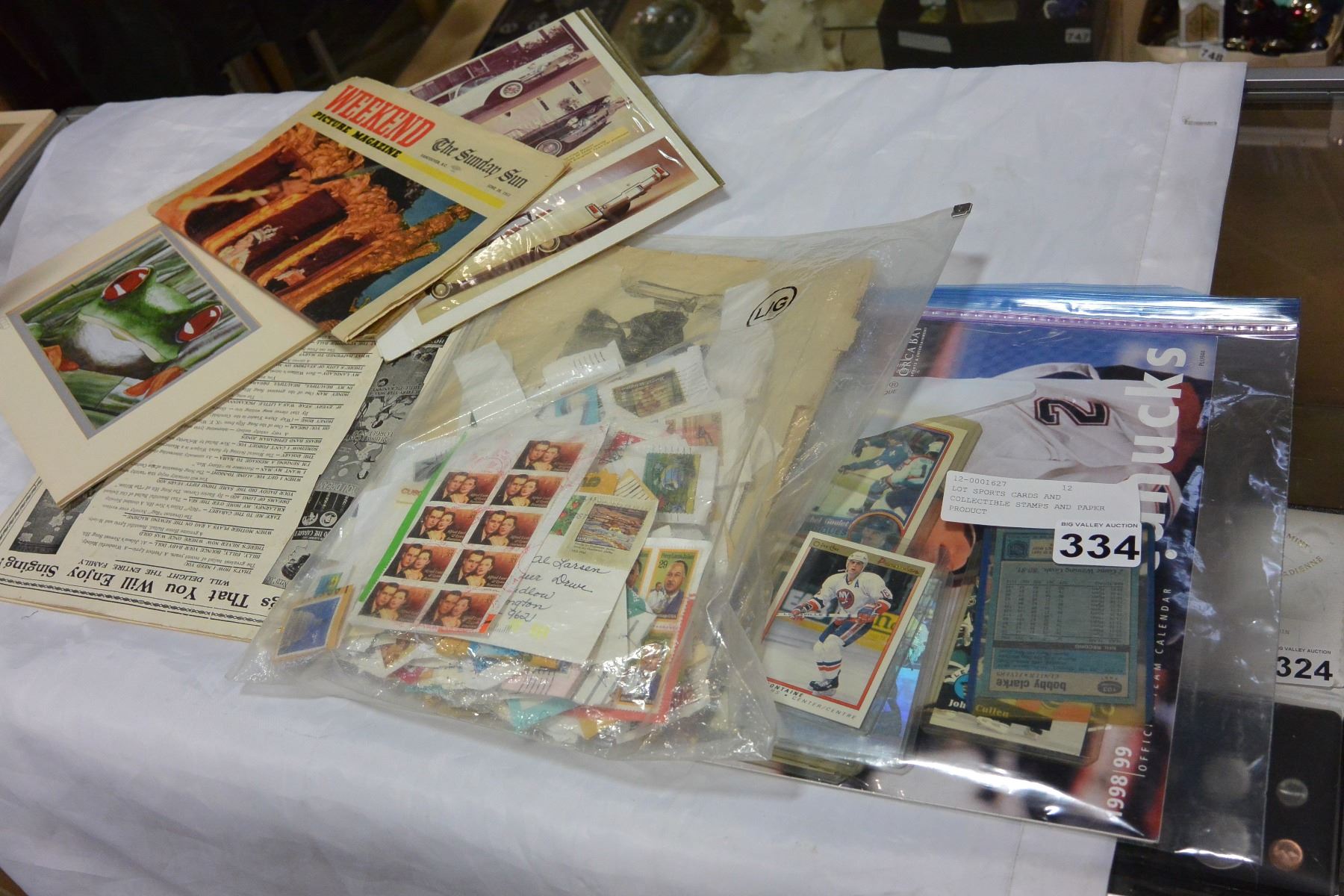 LOT SPORTS CARDS AND COLLECTIBLE STAMPS AND PAPER PRODUCT