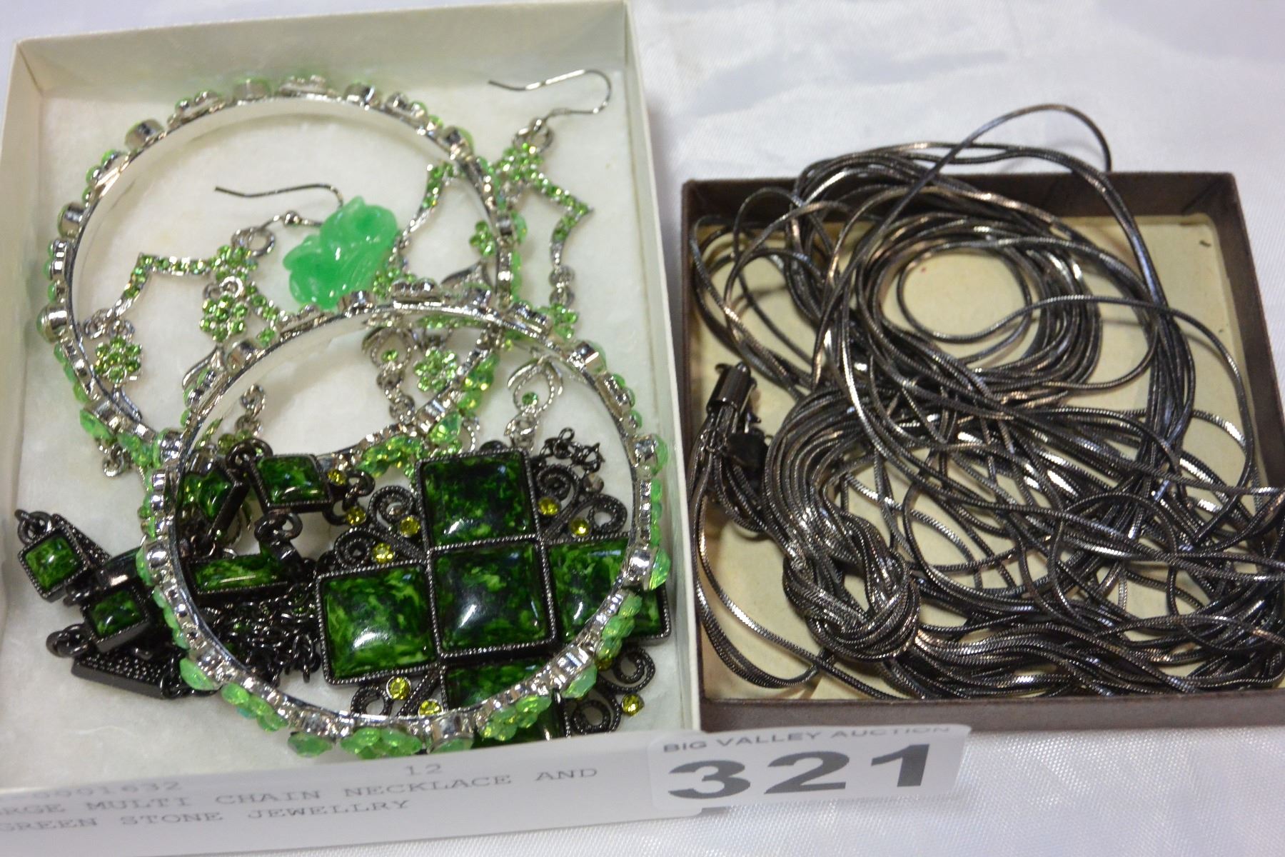 LRGE MULTI CHAIN NECKLACE AND GREEN STONE JEWELLRY