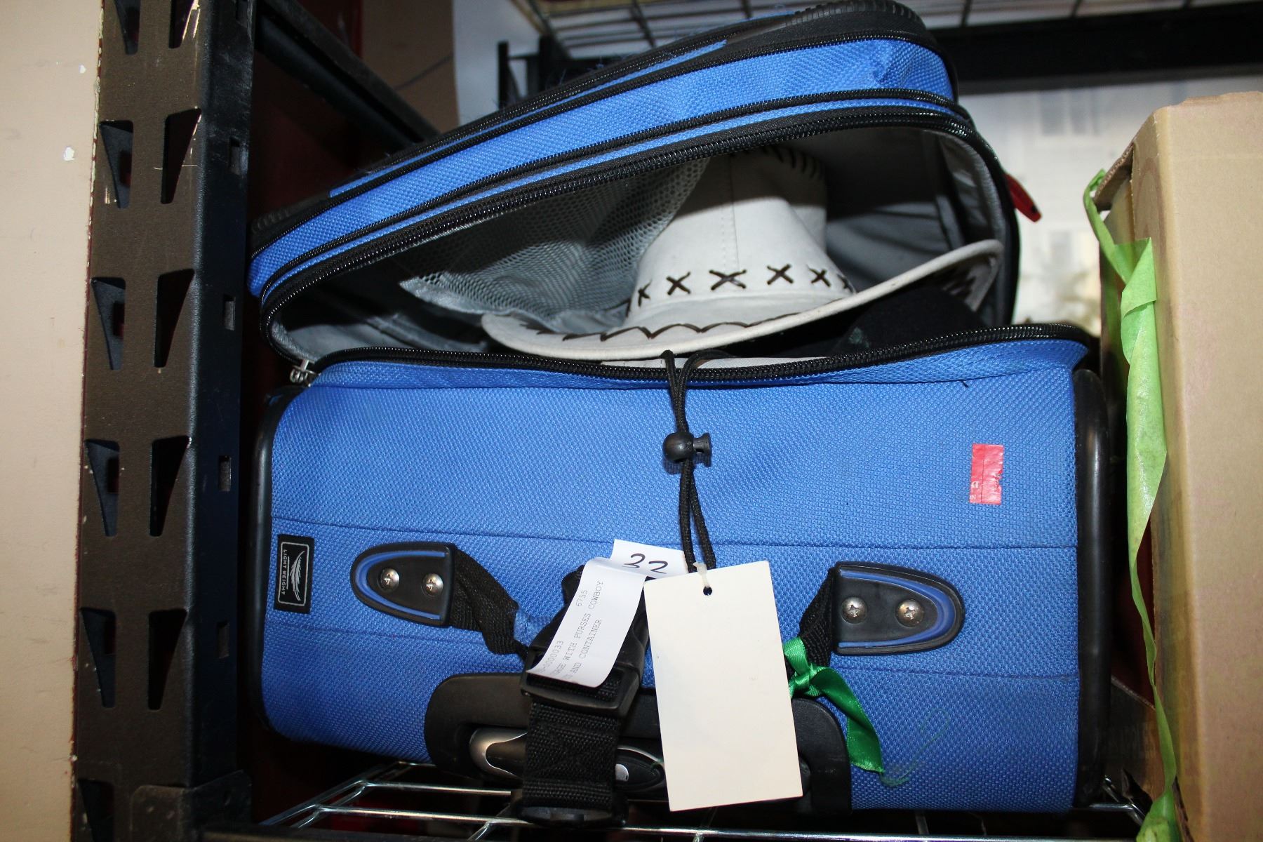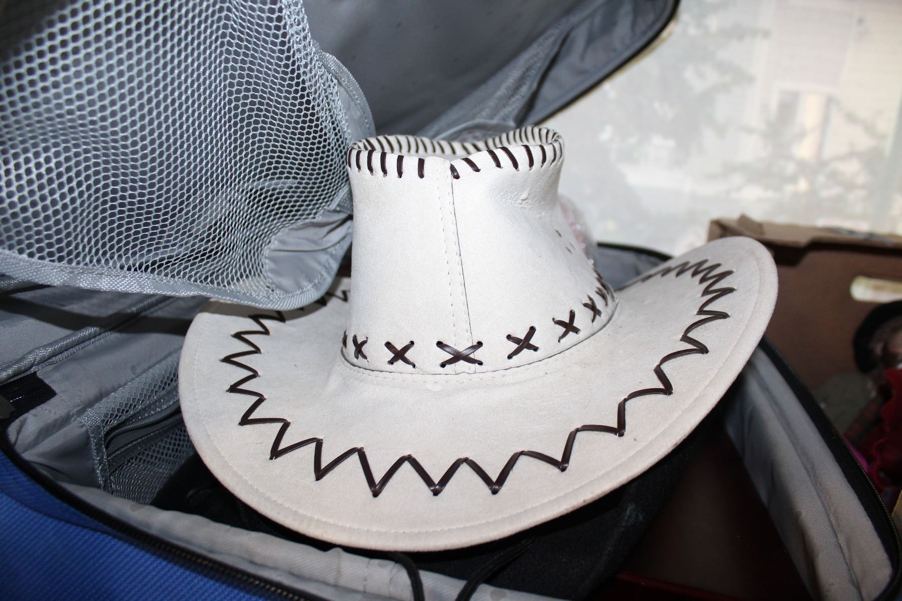 LUGGAGE WITH PURSES COWBOY HATS AND CONTAINER