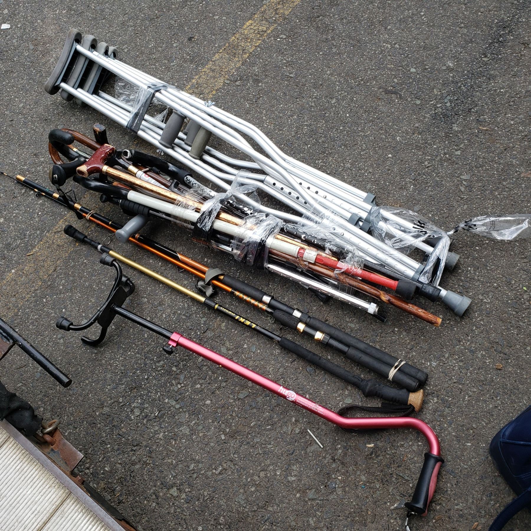 Lot of Lost Property canes, fishing rod, walking stick and crutches