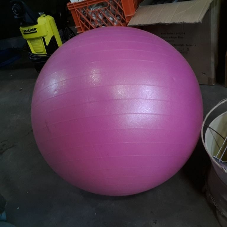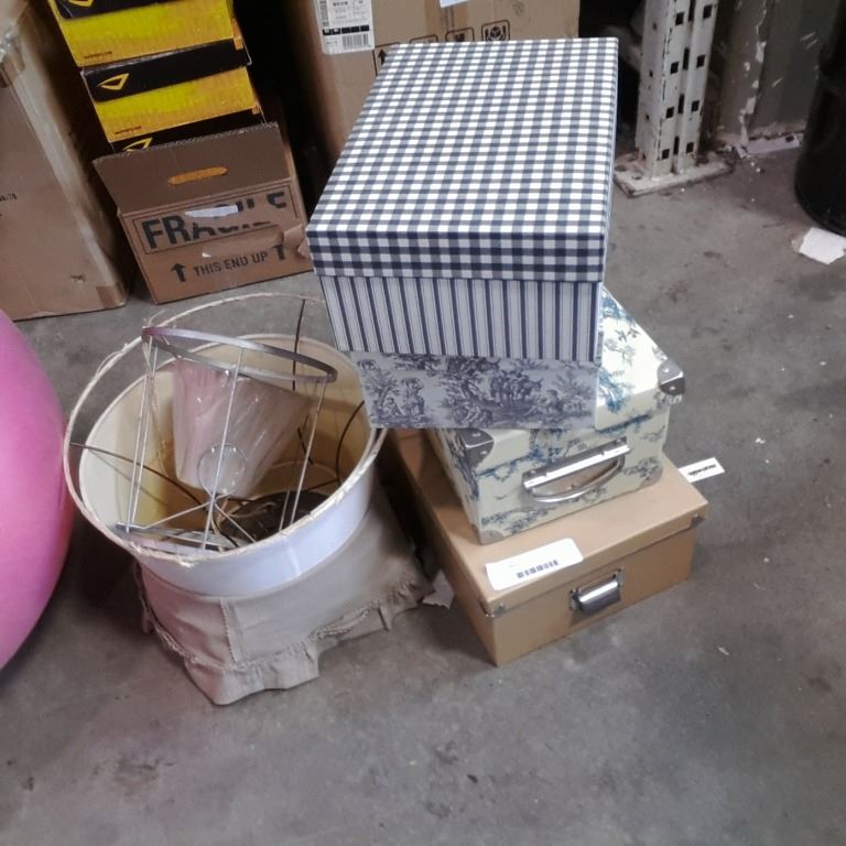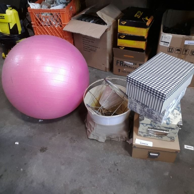 Lot of hard side boxes and lampshades with exercise ball