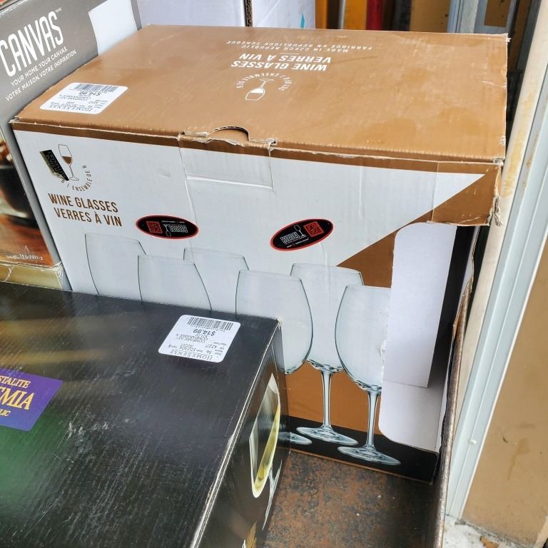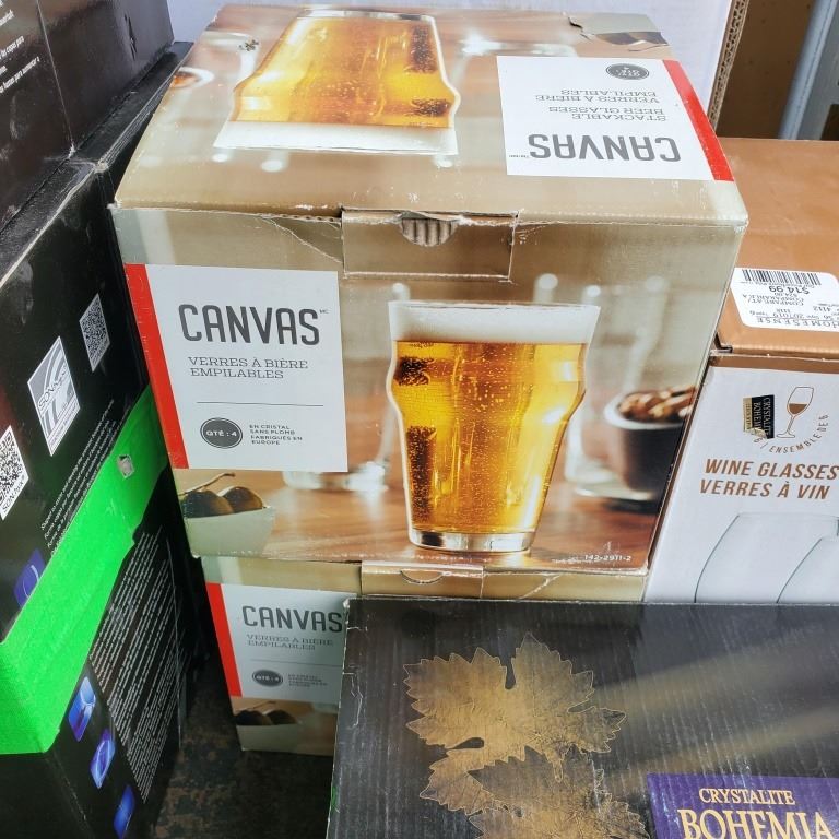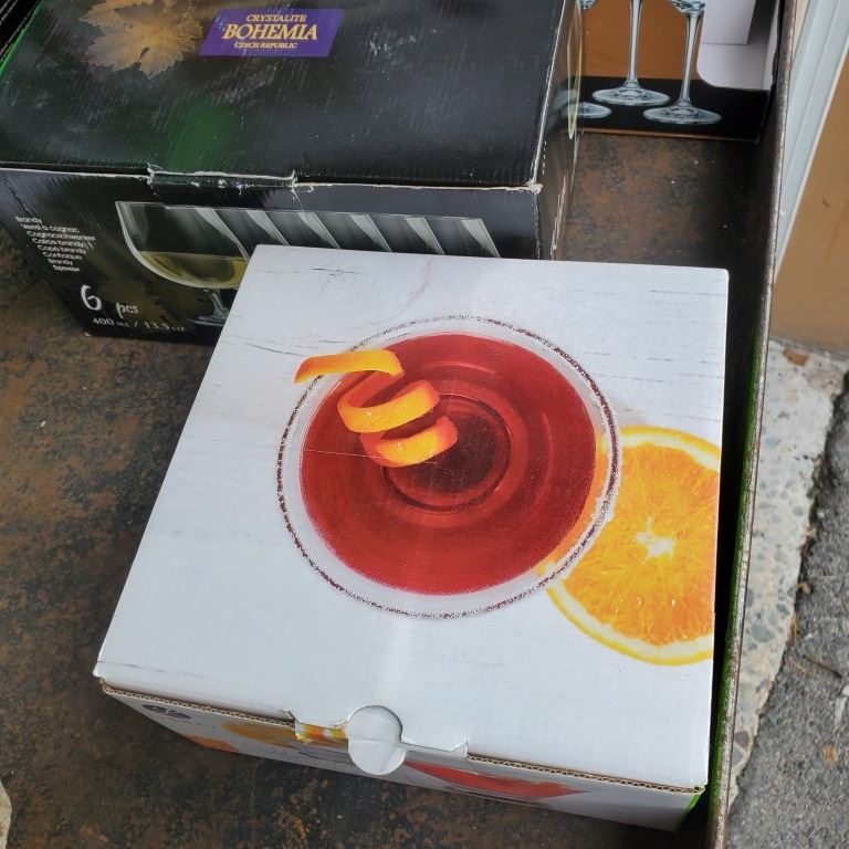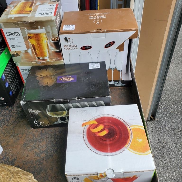 Lot of new beer glasses, brandy glasses, wine glasses (missing one) and cosmopolitan glasses