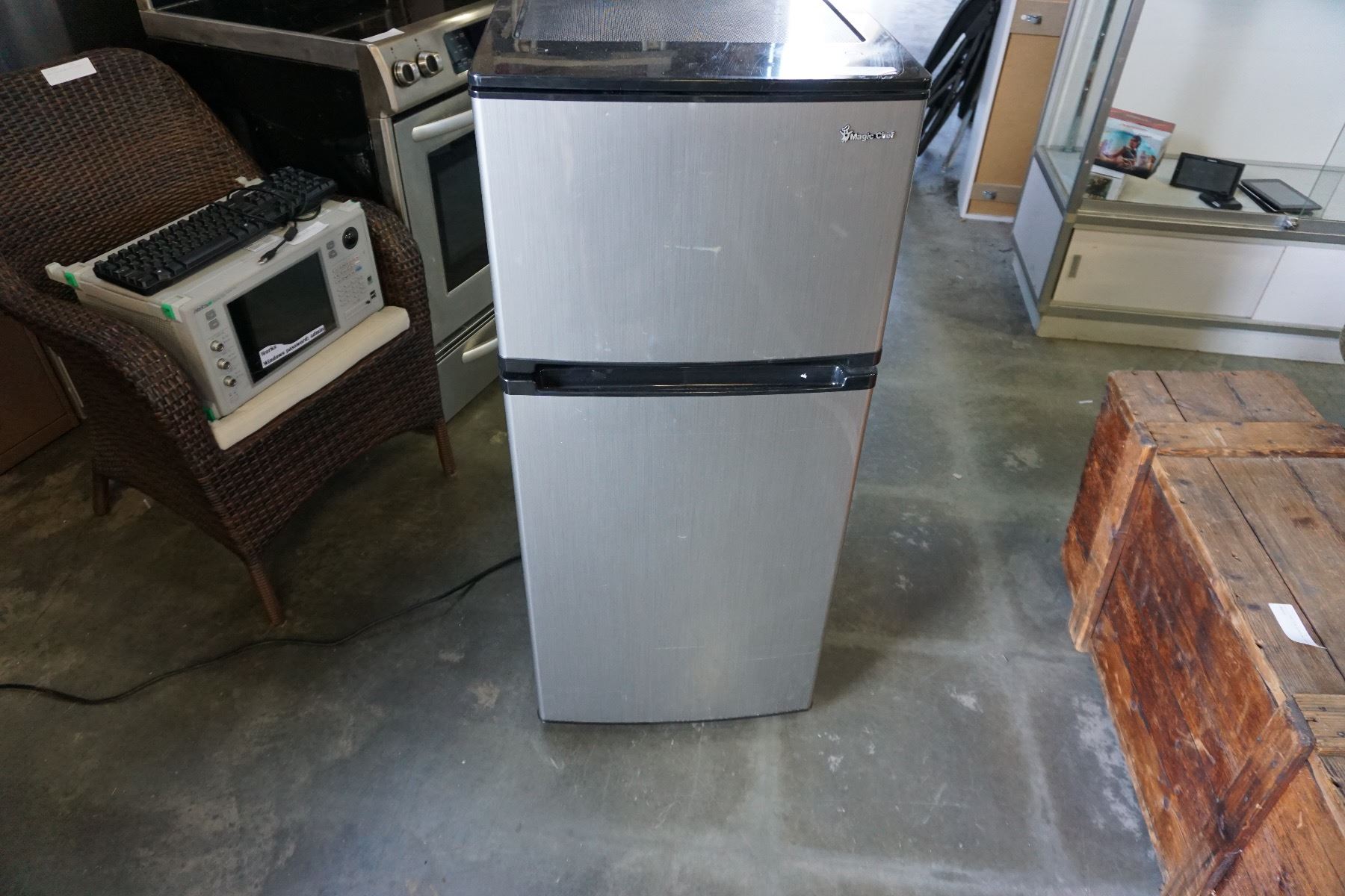 MAGIC CHEF BLACK AND STAINLESS MINIATURE FRIDGE W/ TOP FREEZER