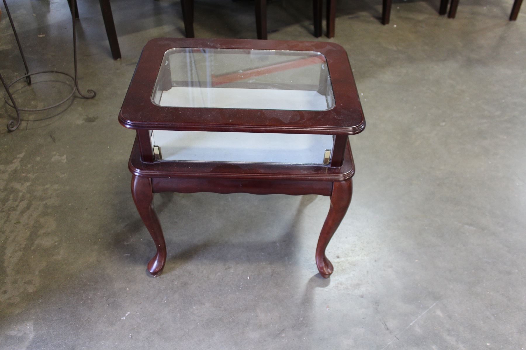MAHOGANY FINISH GLASS DISPLAY ENDTABLE