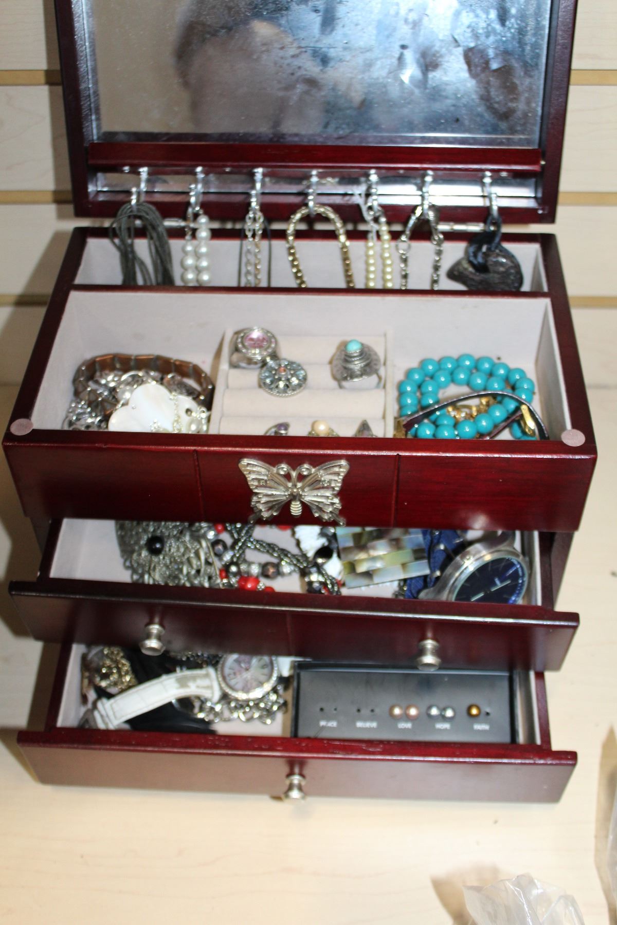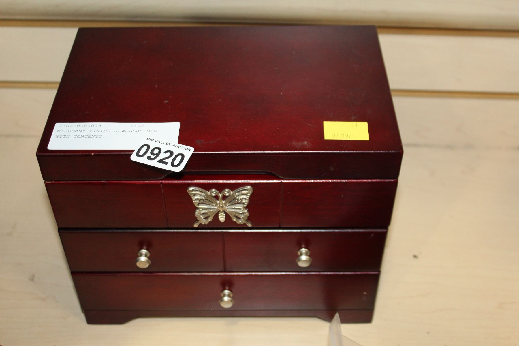 MAHOGANY FINISH JEWELLRY BOX WITH CONTENTS